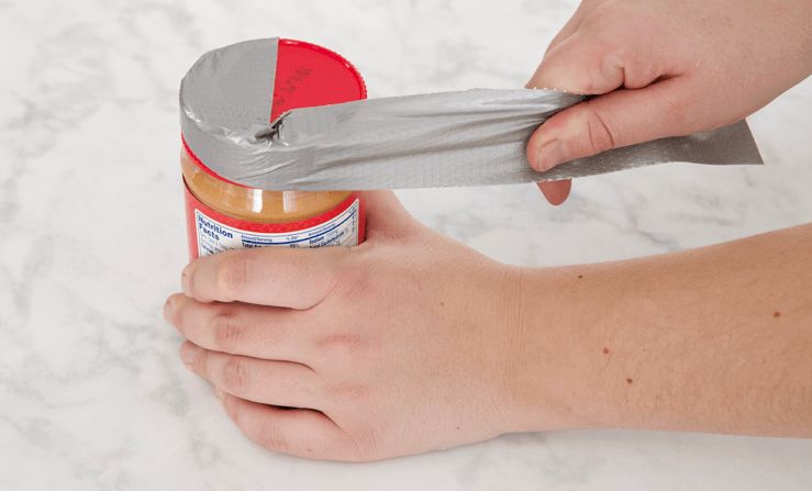 新买的玻璃瓶装罐头,用宽胶带在瓶盖上以逆时针方向缠绕几圈,注意不要把胶带缠在瓶身上,觉得缠得比较结实的时候,剪断后对折做成一个把手,左手握住瓶身,右手拇指套在把手上拧瓶盖,马上就能拧开。