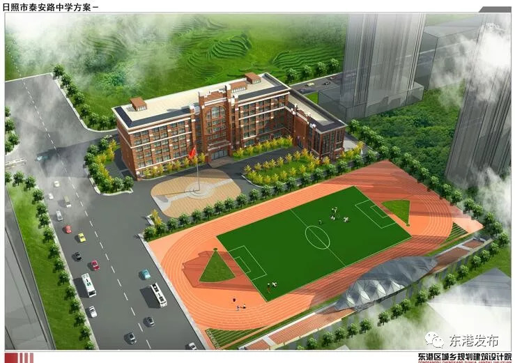 泰安路中学位于曲阜路以东、泰安路以北、胶州路以南,是东港区政府为解决城镇普通中小学大班额问题计划建设的一处初级中学。总投资6100万元,总建筑面积20344平方米,建设6层综合教学及辅助楼1栋,以及地下停车场、看台、道路、广场、管网等附属设施,可容纳30个教学班共1500名学生就读。