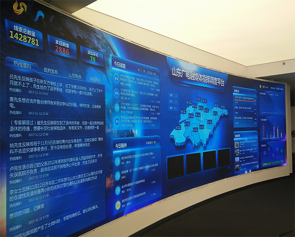 资讯中心呈长方形布局,在调度中心的一头,有一块巨大的曲面大屏,这块曲面大屏被称为整个山东广播电视台的融媒体指挥调度平台。屏幕上展示有四大系统:信息汇集系统、选题实时跟踪系统、新闻发布系统、传播效果监测反馈系统。