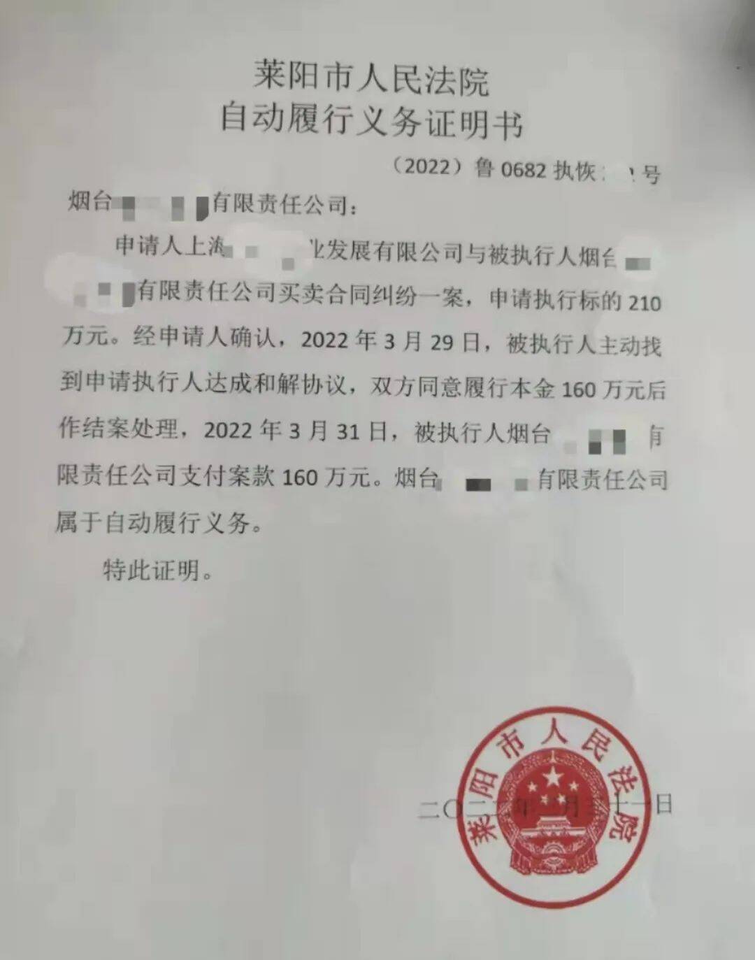 “以往案件进入强制执行阶段后,会对被执行人进行征信惩戒,在法定代表人乘坐飞机高铁、工商登记审核、融资信贷、招投标等方面进行限制,制约了企业的正常运转。以往在当事人履行完毕后出具的结案通知书中,无法体现是其主动履行还是被动履行,而向符合条件的被执行人发放自动履行义务证明书,是结案证明进一步细化的结果,能为积极主动履行义务的被执行人‘正名’,助其恢复信用等级,拓展相关业务,为企业创造更好的营商环境。”莱阳法院党组成员、分管执行的副院长盖东彦解释说。