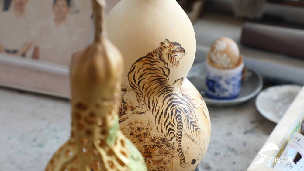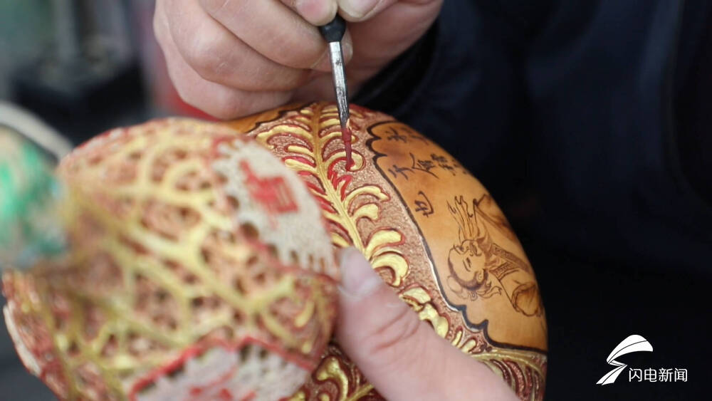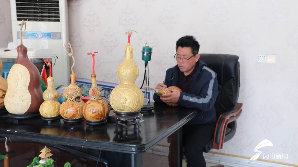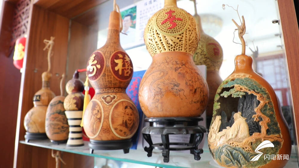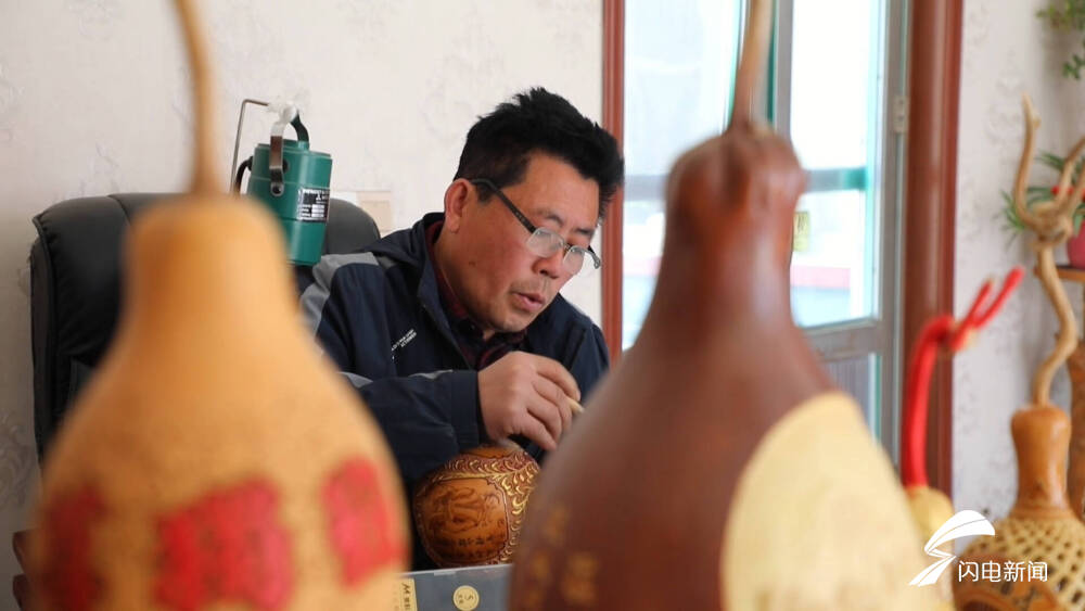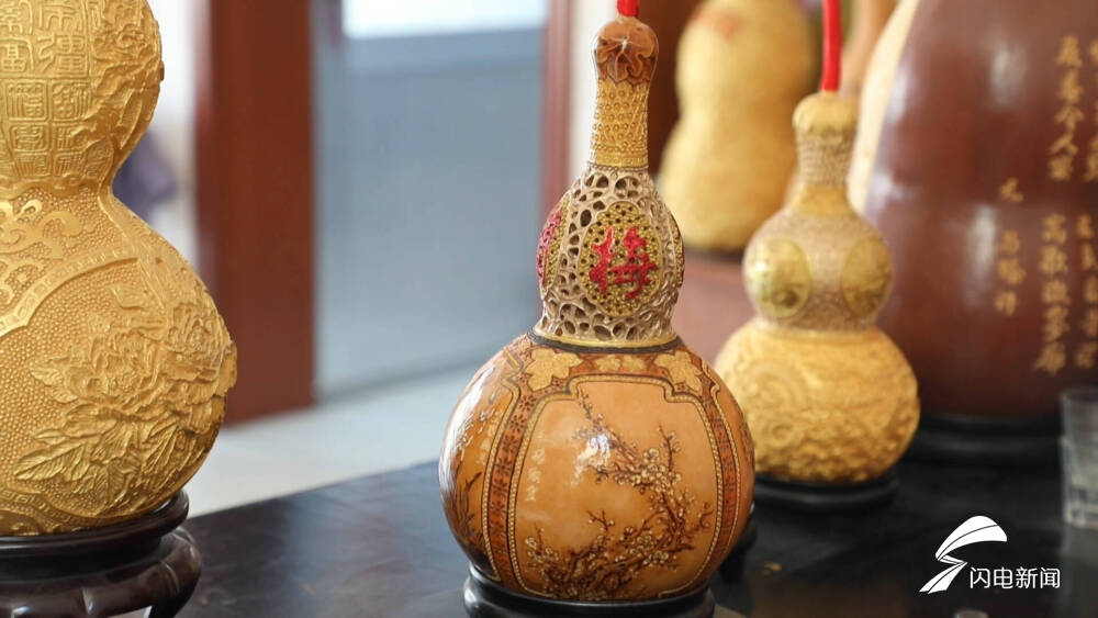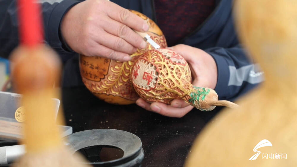 齐鲁网·闪电新闻5月7日讯 葫芦谐音“福禄”,其雕刻艺术品传颂千年,寓意福禄吉祥、喜庆祥和。在德州市临邑县,葫芦雕刻传承人任德斌以刀为笔,用娴熟的技艺刀法创作出一件件形态各异、内涵丰富的作品,在雕刻中传承技艺文化。