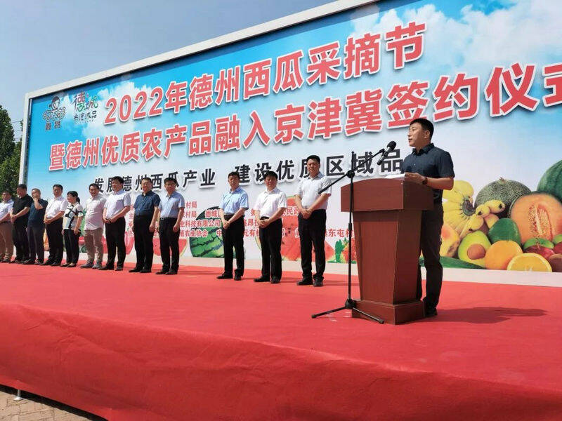 齐鲁网·闪电新闻5月29日讯 为推动农业转型升级、提质增效,提高农业品牌影响力,深度融入京津冀协同发展,28日,以“发展德州西瓜产业,建设优质区域品牌”为主题的2022年德州西瓜采摘节暨德州优质农产品融入京津冀签约仪式在山东鑫昂农业科技示范基地举行。