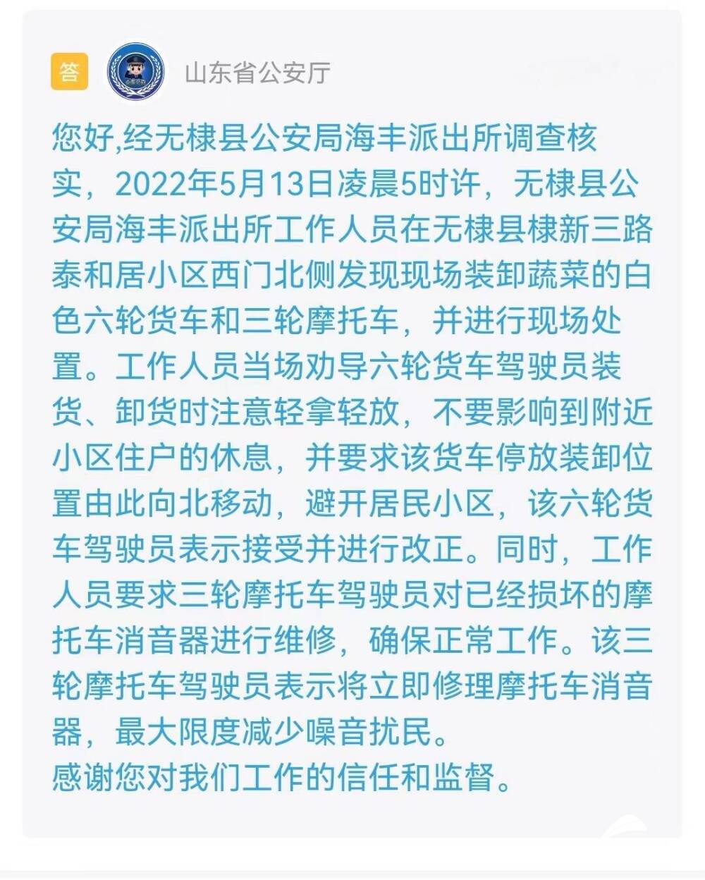 山东省公安厅收到留言后,进行了办理并回复说:经无棣县公安局海丰派出所调查核实,2022年5月13日凌晨5时许,无棣县公安局海丰派出所工作人员在无棣县棣新三路泰和居小区西门北侧发现现场装卸蔬菜的白色六轮货车和三轮摩托车,并进行现场处置。工作人员当场劝导六轮货车驾驶员装货、卸货时注意轻拿轻放,不要影响到附近小区住户的休息,并要求该货车停放装卸位置由此向北移动,避开居民小区,该六轮货车驾驶员表示接受并进行改正。同时,工作人员要求三轮摩托车驾驶员对已经损坏的摩托车消音器进行维修,确保正常工作。该三轮摩托车驾驶员表示将立即修理摩托车消音器,最大限度减少噪音扰民。