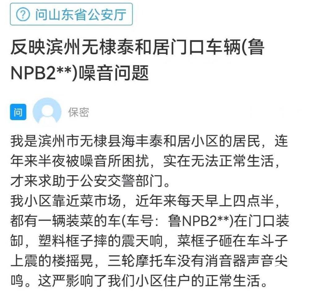 齐鲁网·闪电新闻6月15日讯 一位滨州的网友在《问政山东》网络问政平台留言说,自己是无棣县海丰泰和居小区的居民,小区靠近菜市场,近年来每天早上四点半,都有一辆装菜车(车号:鲁NPB2**)在门口装缷,噪音很大,严重影响了小区住户的正常生活,特此求助于有关部门。