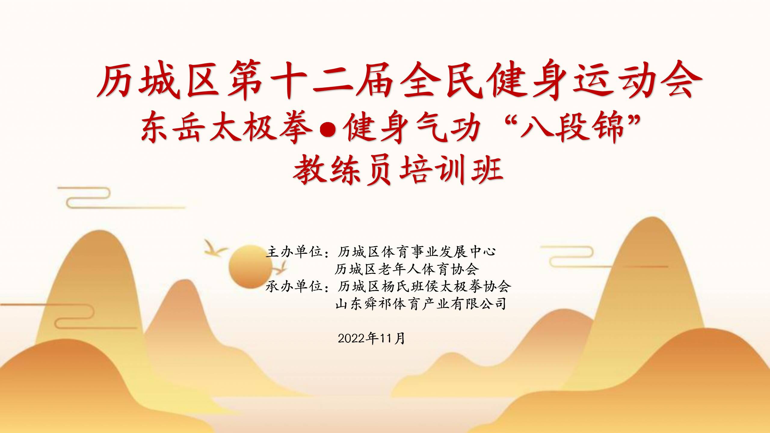 活动由济南市历城区体育事业发展中心、历城区老年人体育协会主办,历城区杨氏班侯太极拳协会、山东舜祁体育产业有限公司协办。