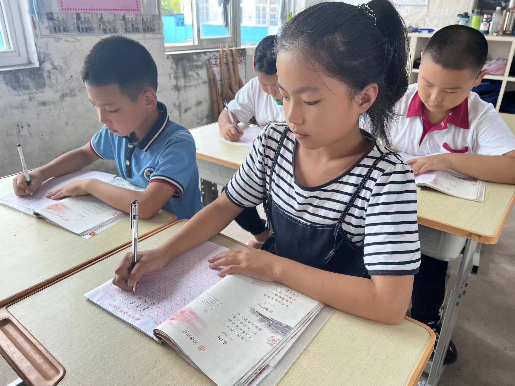 二到五年级组织“写规范字”书法比赛,学生端正坐姿,一笔一划认真书写中国字。