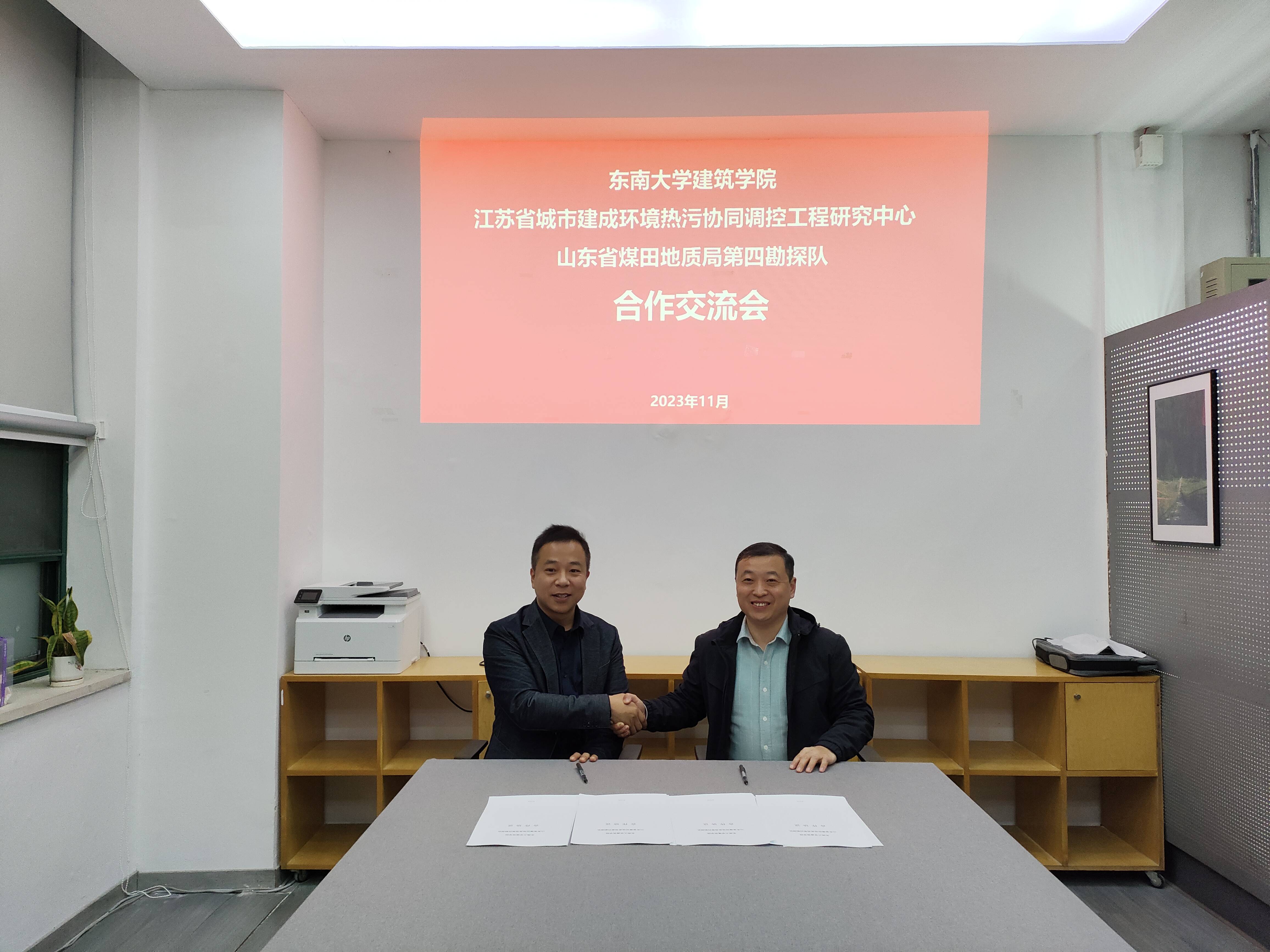 在东南大学建筑学院南京玄武区四牌楼校区,国家杰出青年、东南大学首席教授、江苏省特聘教授、江苏省城市建成环境热污协控工程研究中心主任曹世杰向山东省煤田地质局四队一行介绍了可持续建成环境研究核心理念、团队架构、研究成果等。李海波介绍了单位基本概况、地热能产业发展、自研浅层地温能系统节能诊断智慧平台推广应用情况,并签订了战略合作协议。