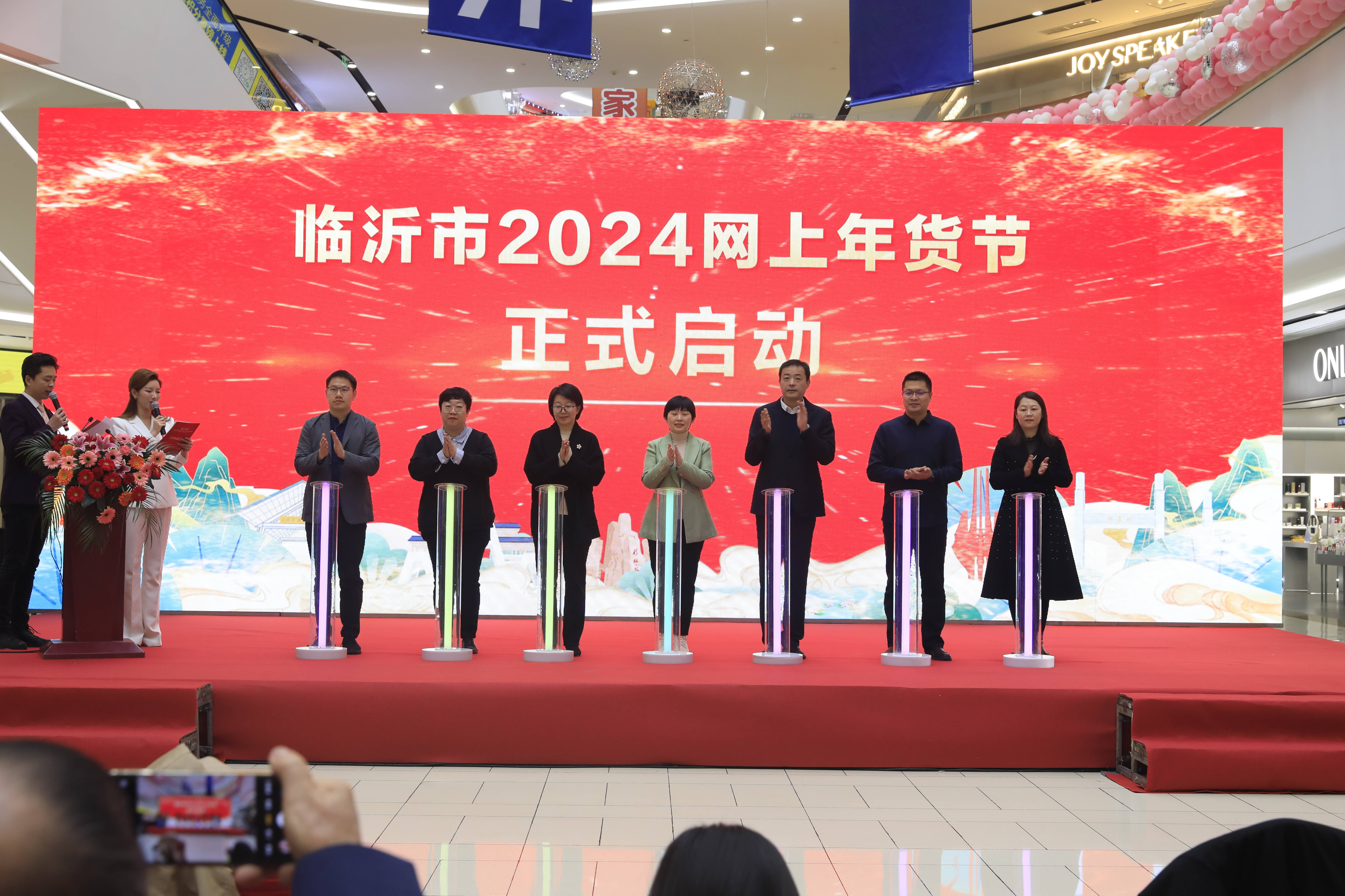 山东省商务厅电商处一级主任科员赵婧、临沂市沂蒙精神研究中心副主任吕雷、临沂市商务局四级调研员李玉菽、山东广播电视台生活农科管理运营中心副总监杨玲涛、临沂商城管委会协调督导二科科长马莹、阿里巴巴1688政府事务总监刘涛、山东乐拍商业有限公司副总经理钱景芝共同参加了“临沂市2024网上年货节”启动仪式。