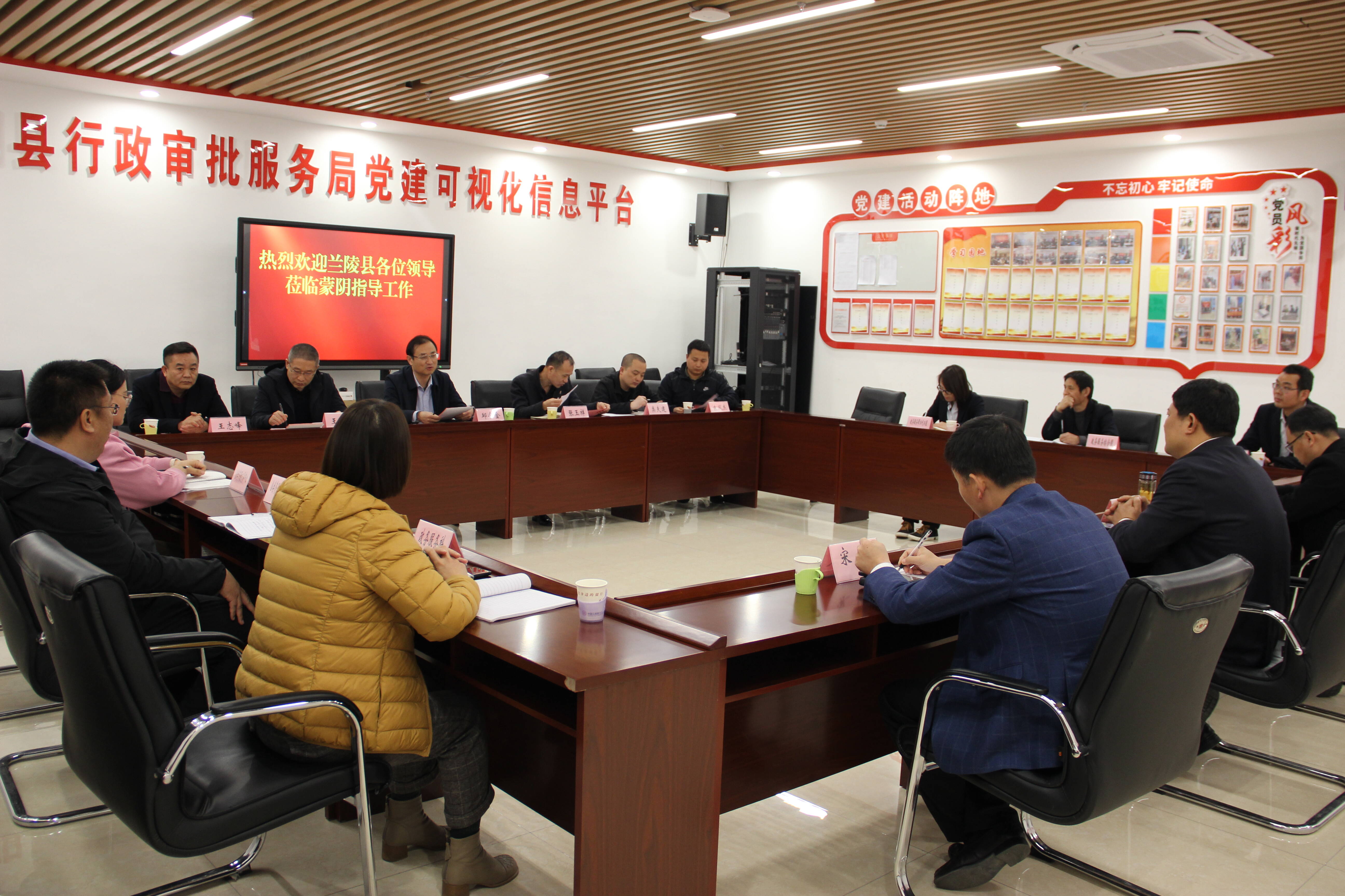 座谈会上,蒙阴县行政审批服务局党组副书记、局长黄勇对邱局长一行的到来表示热烈欢迎,并介绍了公共资源交易领域、政务服务大厅建设、服务模式及运营管理等方面的情况,并就招标工作运行情况、制度建设、政务服务中心单位入驻、日常管理运行、政务服务体系建设等方面的内容进行了深入交流探讨。