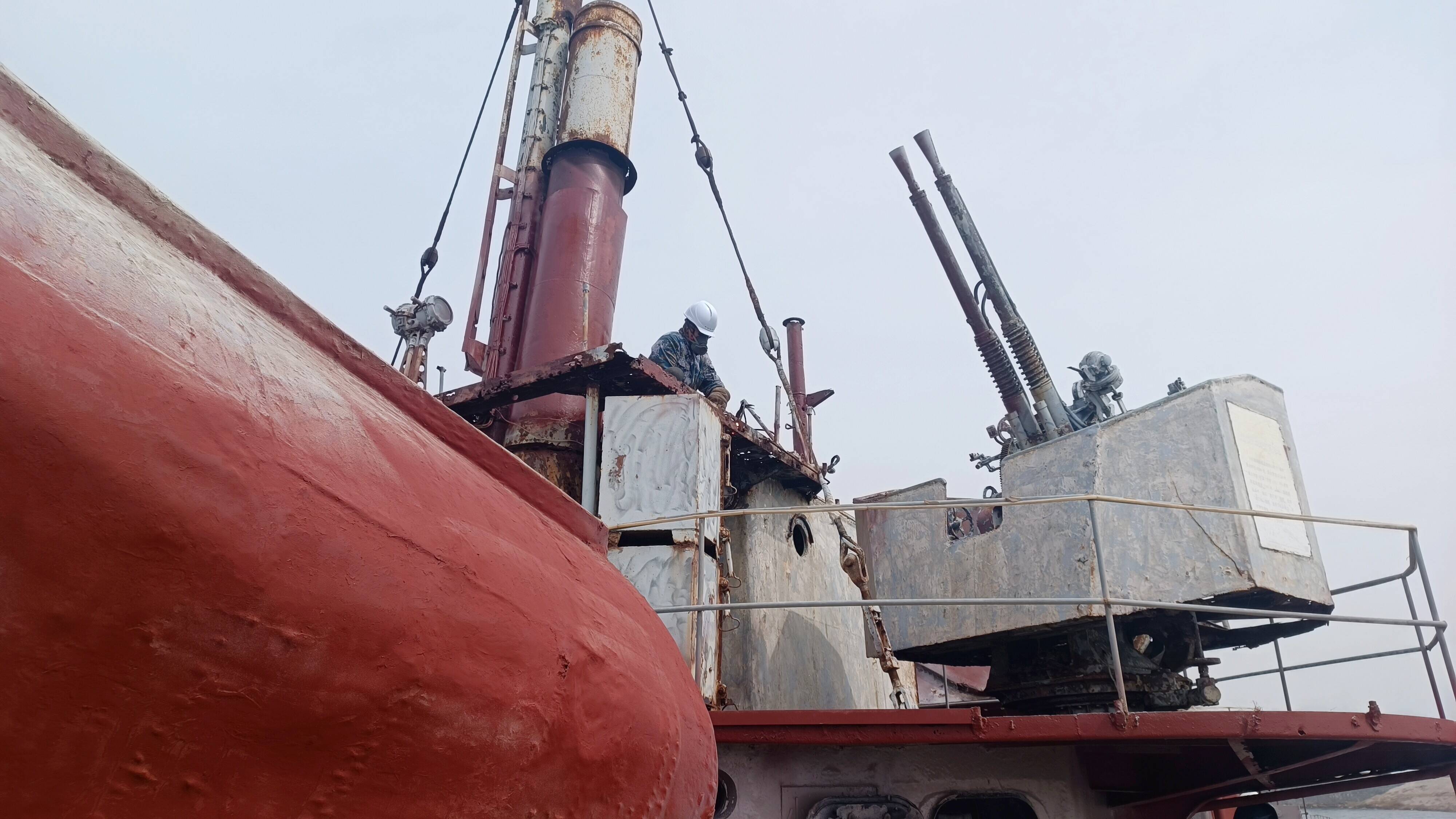 在位于乳山银滩的103驱逐舰上,工作人员正在进行露天腐蚀部位手工打磨、舱内塌陷处支撑加强及安装室外舷灯、铺设电缆、恢复照明等工程。
