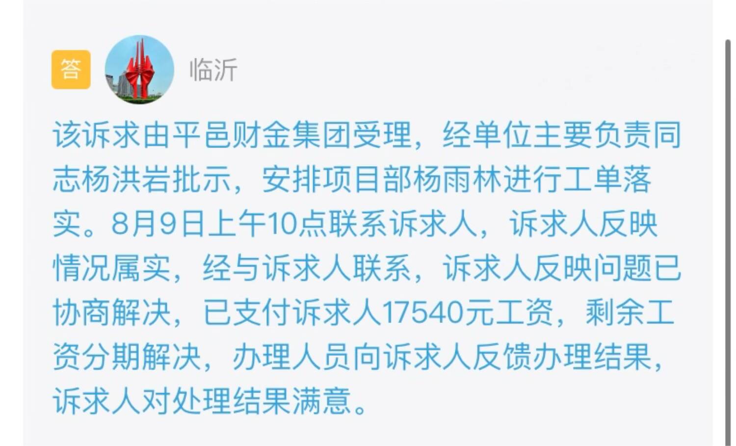 收到留言后,临沂市相关部门联系双方并协商解决,已支付诉求人部分工资,剩余工资分期支付。