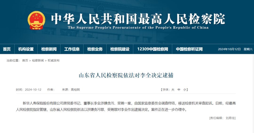 今天,最高人民检察院官网发布消息称,新华人寿保险股份有限公司(简称“新华保险”)原党委书记、董事长李全涉嫌贪污、受贿一案,由国家监察委员会调查终结,移送检察机关审查起诉。日前,经最高人民检察院指定管辖,山东省人民检察院依法以涉嫌贪污罪、受贿罪对李全作出逮捕决定。案件正在进一步办理中。