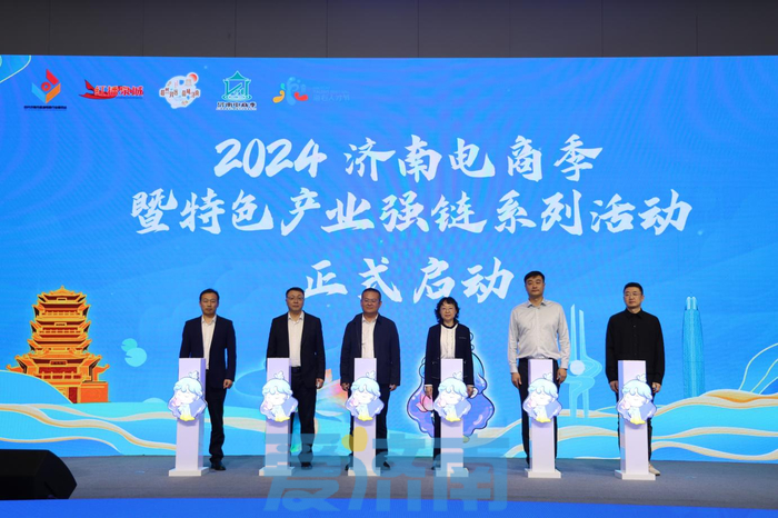 济南市委组织部副部长、市公务员局局长、市委人才办常务副主任王玉跃,济南市委市直机关工委分管日常工作的副书记尹红梅,济南日报报业集团党委书记、董事长、济南日报社社长田俊林,济南市商务局党组书记、局长赵治文,山东省电子商务协会秘书长于登杰,京东集团副总裁肖肃共同启动2024济南电商季暨电商特色产业强链系列活动。