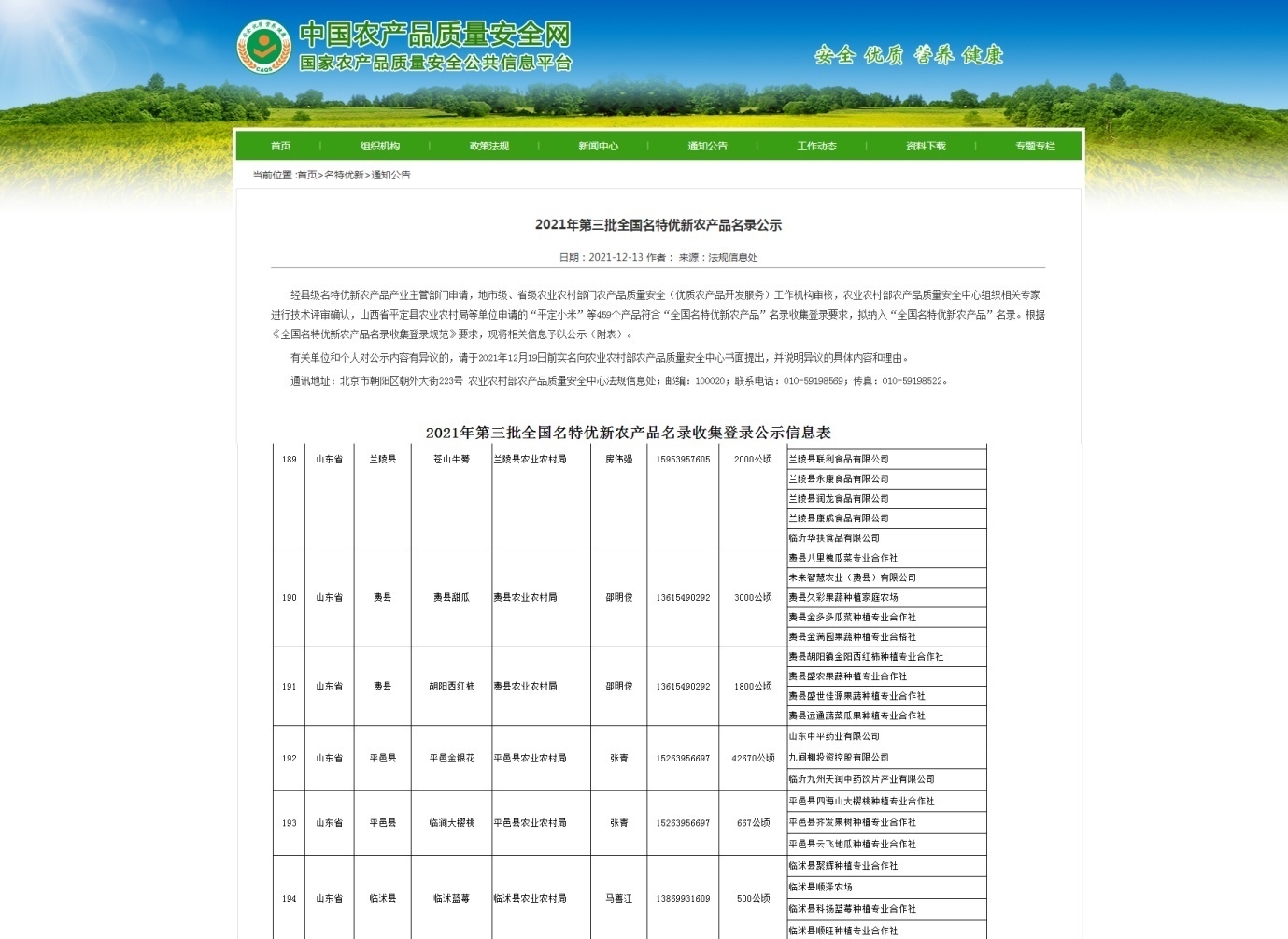12月13日,中国农产品质量安全网公示了2021年第三批全国名特优新农产品名录,临沂市“苍山牛蒡”“费县甜瓜”“胡阳西红柿”“平邑金银花”“临涧大樱桃”“临沭蓝莓”等6个农产品榜上有名。