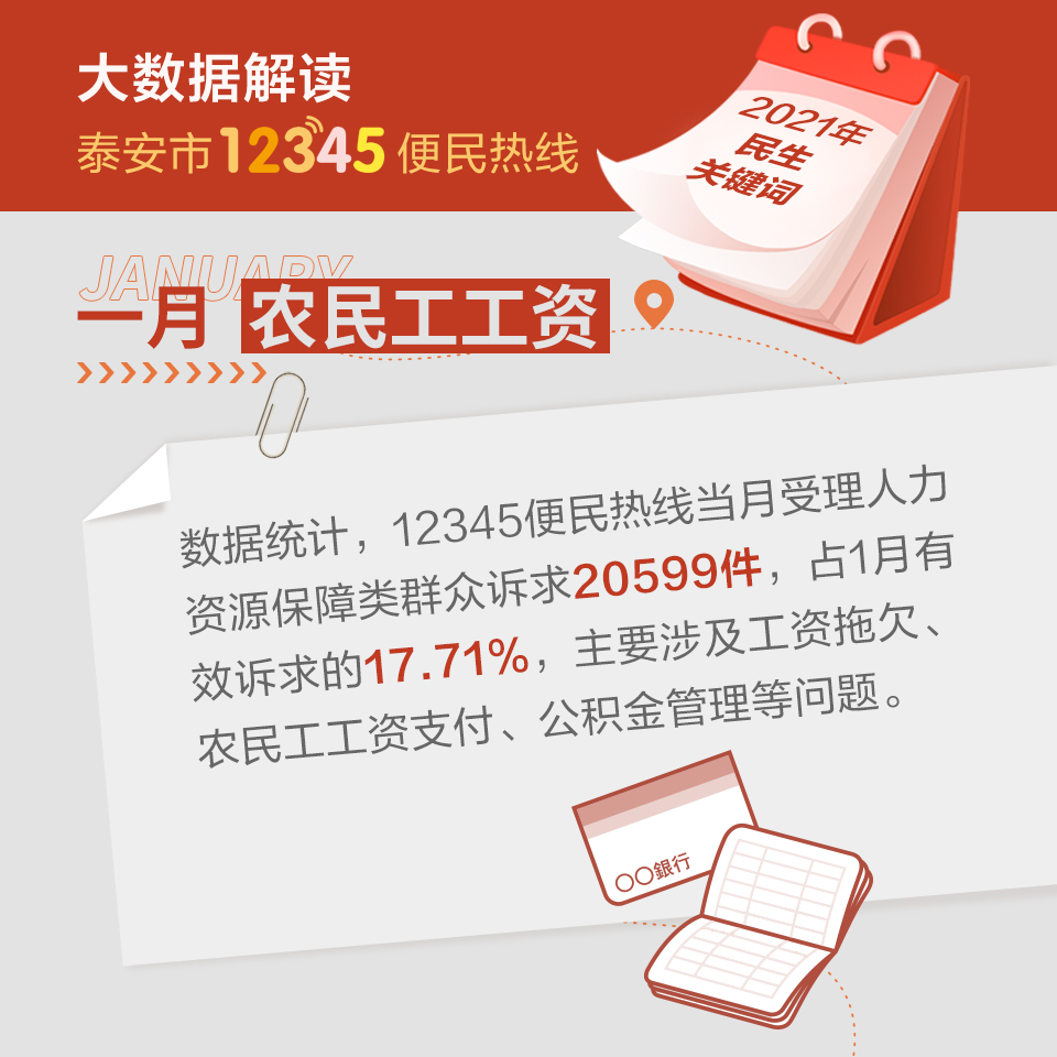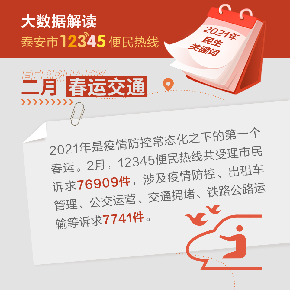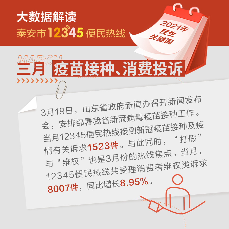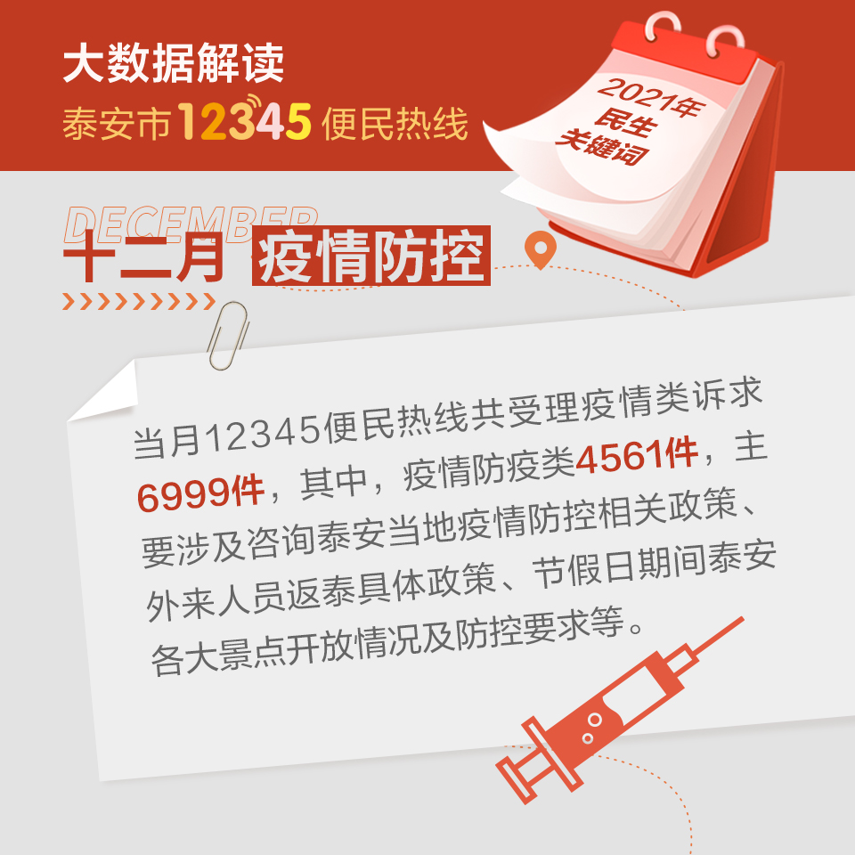 帮助农民工讨薪,答复疫苗接种问题,解答划片入学问题,回复游客关于购票、疫情防控、停车等各类咨询……据12345便民热线受理平台统计,2021年热线共受理群众诉求126.65万件,同比增长49.07%。泰安市民关心的问题都有哪些?12345便民热线运用大数据盘点2021年每月的“民生关键词”。【泰安日报社·最泰安全媒体记者 徐文莉 毛洁 编辑 王婷婷 设计 石帆】