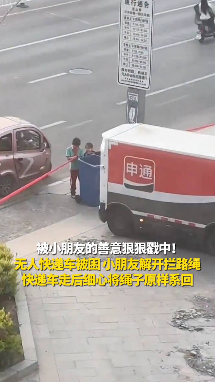 被小朋友的善意狠狠戳中!无人快递车被困 小朋友解开拦路绳 快递车走后细心将绳子原样系回
