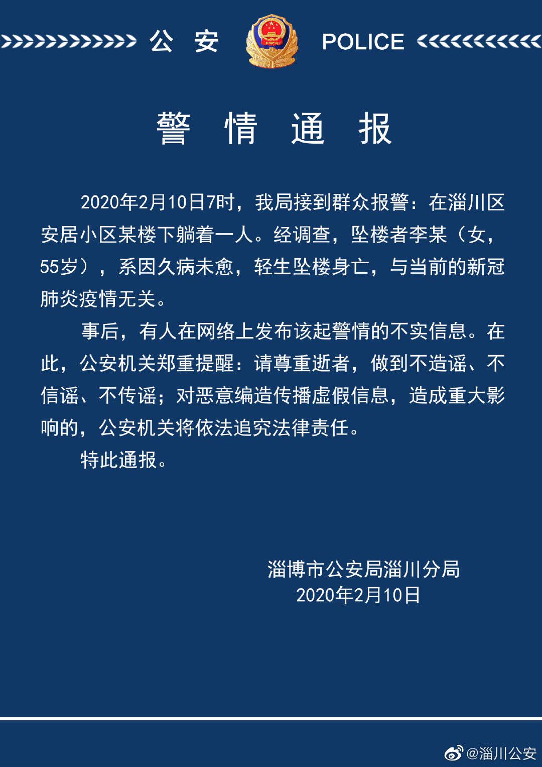 2020年2月10日7时,淄川区公安分局接到群众报警:在淄川区安居小区某楼下躺着一人。经调查,坠楼者李某(女,55岁),系因久病未愈,轻生坠楼身亡,与当前的新冠肺炎疫情无关。事后,有人在网络上发布该起警情的不实信息。在此,公安机关郑重提醒:请尊重逝者,做到不造谣、不信谣、不传谣;对恶意编造传播虚假信息,造成重大影响的,公安机关将依法追究法律责任。