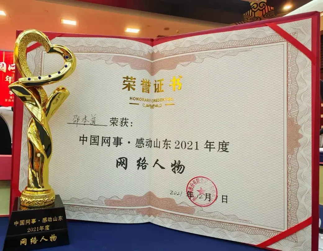 12月1日,“中国网事·感动山东”2021年度网络人物评选颁奖典礼在济南举办。乳山市夏村镇邵家村93岁老党员邵本道获评“中国网事·感动山东”2021年度网络人物。