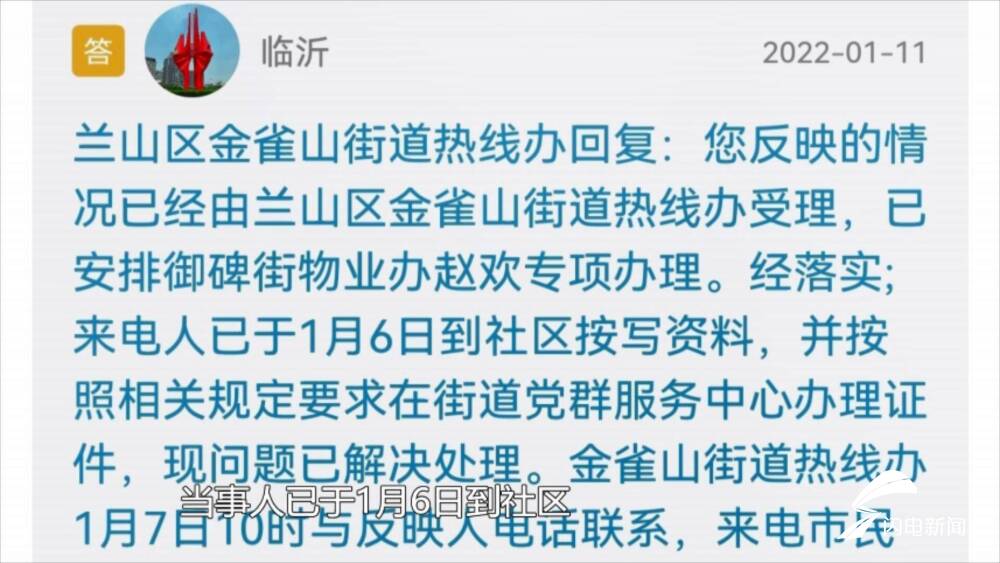 收到留言后,临沂市兰山区金雀山街道热线办很快受理。经落实,当事人已于1月6日到社区,按照相关规定要求,在街道党群服务中心办理证件,现问题已解决。
