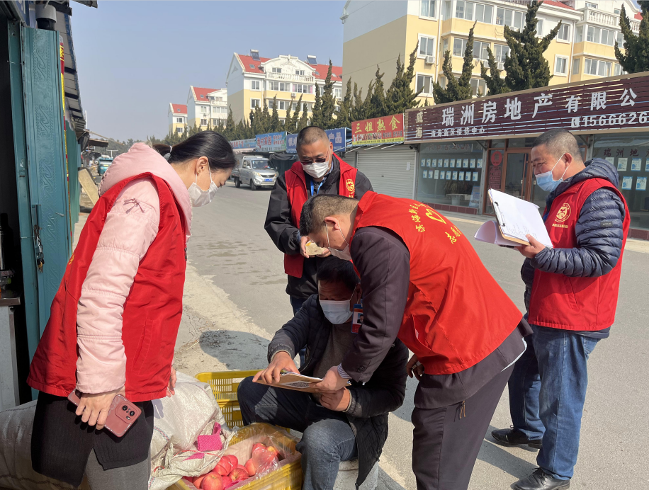 诸往镇组织青年志愿者向镇驻地商户发放疫情防控明白纸,宣传疫情常态化防控注意事项并引导商户严格落实佩戴口罩、测量体温,查验健康码、行程码等事项。