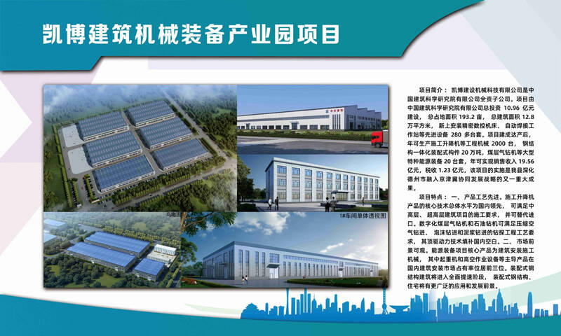 项目由北京建筑机械化研究院有限公司、中天名硕(德州)能源装备科技有限公司联合投资10.96亿元建设,总占地面积 193.2 亩,总建筑面积12.8万平方米,建设生产车间、装配车间、铆焊车间、钢结构车间、表面处理车间及配套生产生活辅助 设施,购置安装精密数控机床、自动焊接工作站、电气实验检验 设备、液压试验设备、材料检测设备以及其他检验检测辅助设备 等先进设备280多台套。项目建成达产后,年可生产施工升降机 等工程机械 2000台,钢结构一体化装配式构件20万吨,煤层气钻机等大型特种能源装备20台套,年可实现销售收入19.56亿元,税收1.23亿元。
