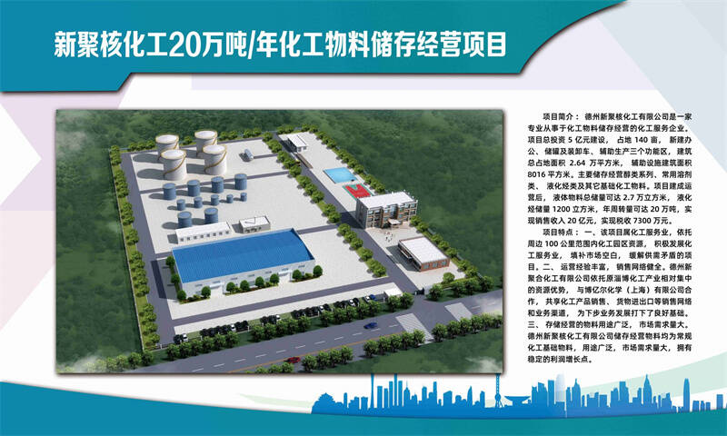 项目由德州新聚核化工有限公司投资5亿元建设,占地140亩,属于化工服务类企业,主要为德州及周边化工企业提供化工原料存储、分类及经营。项目建设车间、仓库、罐区以及配套交接磅房、装卸车系统、消防系统等,主要储存经营醇类系列(甲醇、乙醇、脂肪醇类等)、常用溶剂类(丙酮、氯化亚砜、DMF等)、液化烃类(环氧乙烷、丁二烯、液氨等)及其它基础化工物料(醋酸、丙烯酸、丙烯腈、精酸、甘油等),建成后可年储存经营化工原料20万吨,实现年销售收入20亿元,税收7300万元。