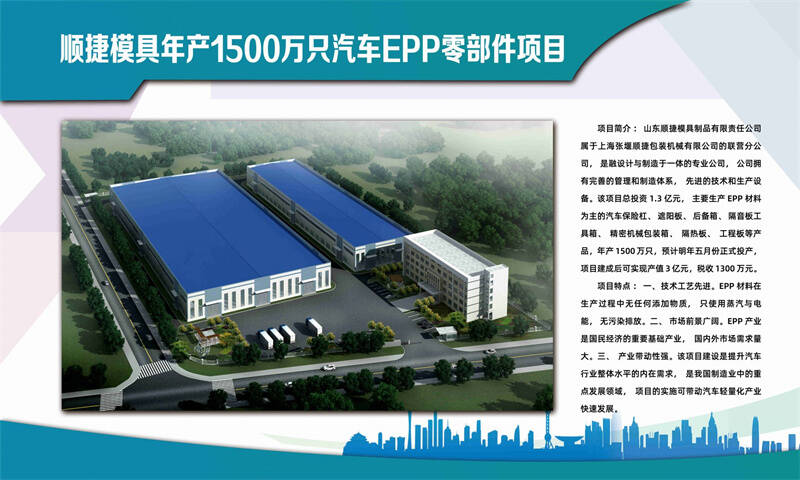 项目由上海顺捷新材料有限公司投资1.3亿元建设,占地50亩,新建厂房20000平方米,主要生产以EPP材料为主的汽车保险杠、遮阳板、后备箱、隔音板工具箱、精密机械包装箱、隔热板、工程板等产品,年产1500万只。目前为中国重汽、上海大众、天津大众、陕汽重卡等多家汽车厂商的重要供应商,项目建成投产后,可实现年销售收入3亿元,税收1300万元。