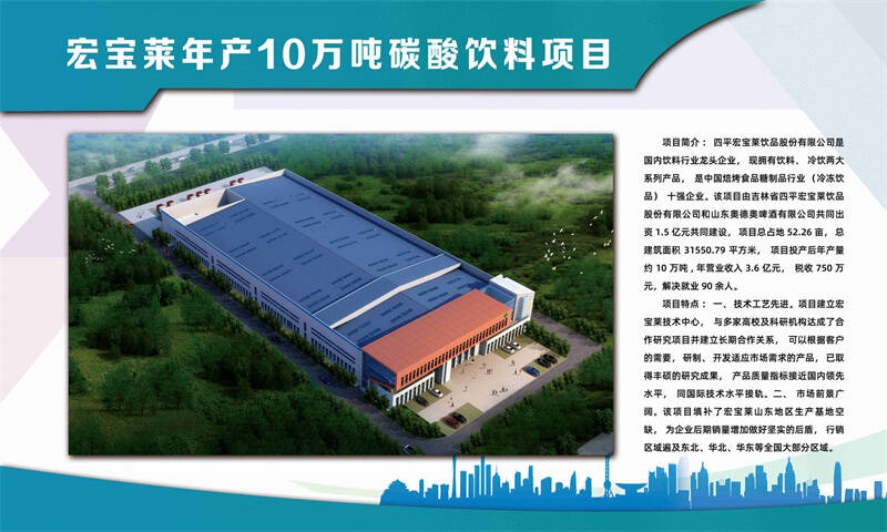 项目由吉林省四平宏宝莱饮品股份有限公司、山东奥德奥啤酒有限公司共同出资1.5亿元共同建设打造宏宝莱德州生产基地,占地52亩,总建筑面积31550.79平方米,建设生产车间、仓库等,购置设备共计33台(套)。项目建成达产后,年可生产碳酸饮料10万吨,实现销售收入3.6亿元,税收750万元,新增就业90人左右。
