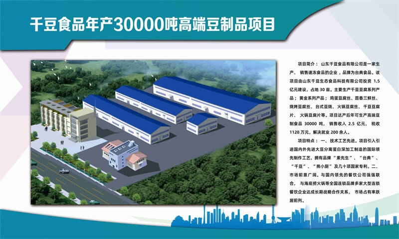 项目由山东千豆生态食品科技有限公司投资1.5亿元建设,项目总占地30亩,总建筑面积10000平方米,产品主要为豆制食品深加工产品、高端鱼豆腐、高端肠类系列,项目主要建设生产车间、仓库、办公楼等。项目建成达产后,可实现年销售收入2.5亿,税收1128万元,解决就业200余人。