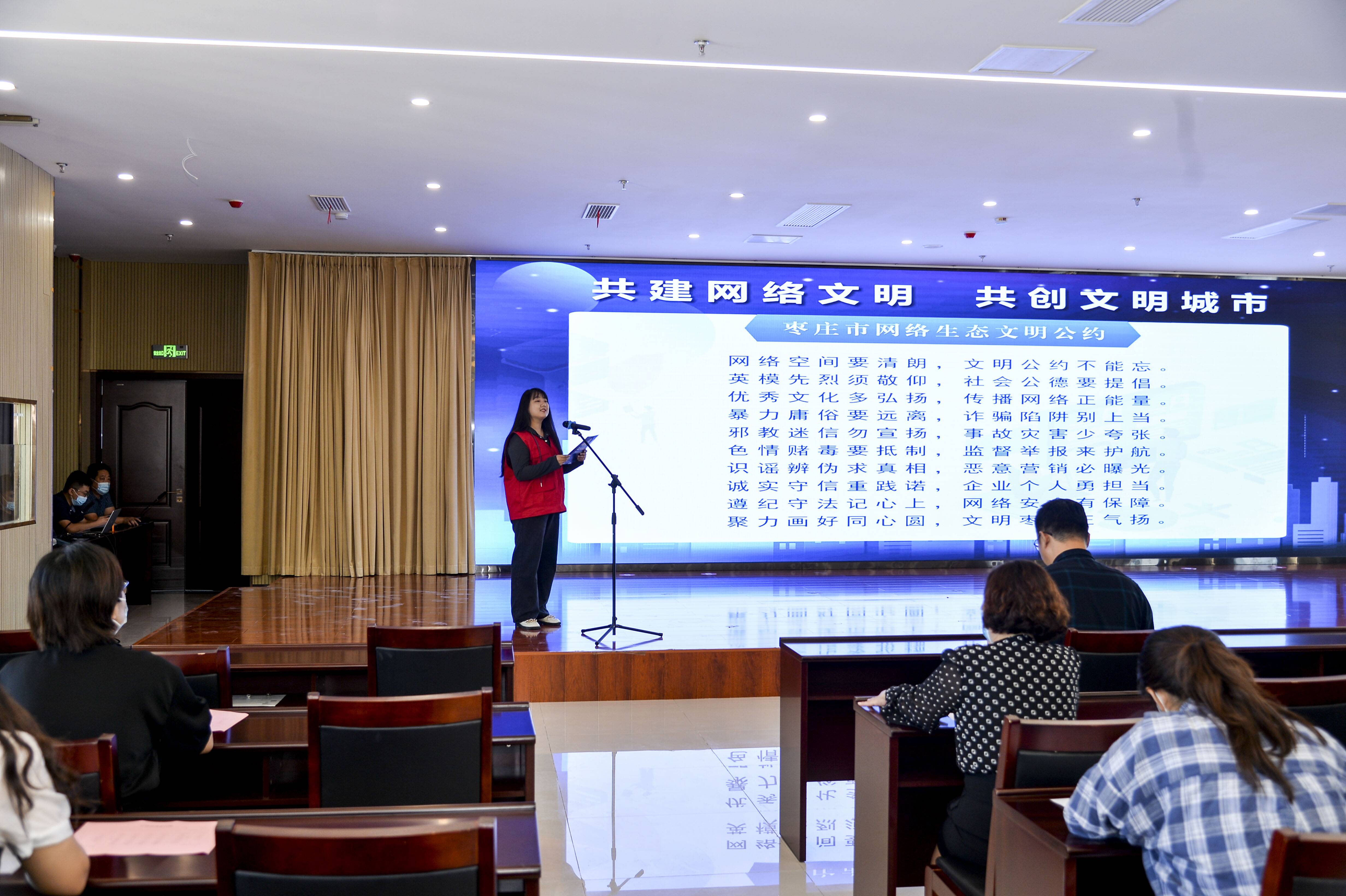 宣讲活动中,大家共同观看了“2022共建网络文明 共创文明城市”专题片、2022年上半年山东省网络辟谣典型案例和网络举报处置典型案例,区网络文明宣讲志愿者张馨雨宣读了《枣庄市网络生态文明公约》。