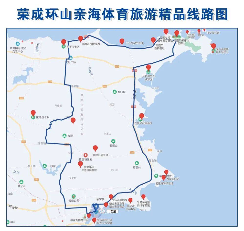 荣成环山亲海体育旅游线路全长136.4km,线路内包含多个国家级风景园区及特色的体育旅游目的地。线路以樱花湖体育公园为起点,聚焦荣成山海美景,串联了荣成市体育馆、爱莲湾海洋牧场、大天鹅国家级自然保护区、成山头风景区、西霞口垂钓基地、半岛环海路自行车骑道、那香海风景旅游度假区、伟德山国家森林公园、巴厘林海房车露营基地等体育、旅游、休闲等元素,沿线可开展登山、骑行、徒步、滑翔伞、自驾、游泳、垂钓、沙滩排球、房车露营等运动项目。