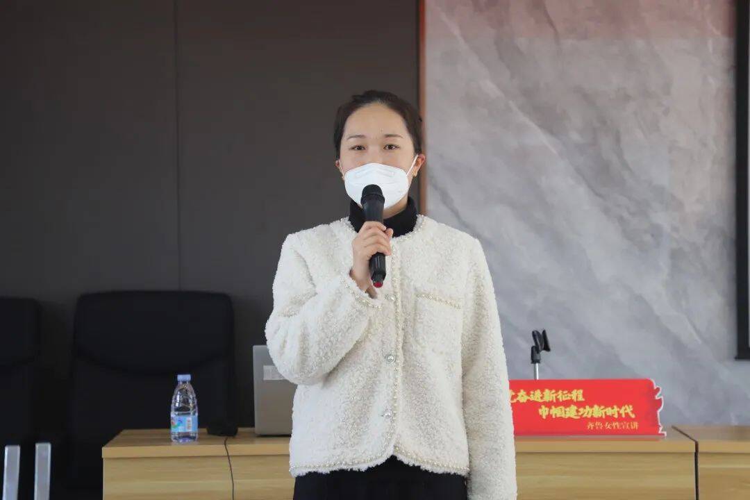 宣讲走进桓台县山东森荣新材料股份有限公司,一线女职工代表宗媛,立足于公司高质量发展,以“深入学习贯彻党的二十大精神,助推企业高质量发展”为主题,围绕“情怀逐梦、产业报国”的远大志向,分享如何在平凡的工作岗位上创造不平凡的业绩,号召广大妇女群众坚定信仰与信念,大力弘扬劳模精神、工匠精神,用持之以恒的坚守和精益求精的追求,为经济社会发展贡献巾帼力量。