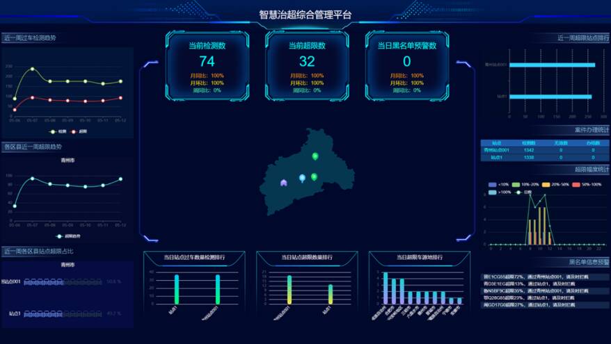 在青岛,崂山区交通运输局工作人员依托科技治超平台,可以直接对系统自动推送的超载超限违法行为进行审核处理。系统发现车辆超载后,治超点120米处的显示屏就会显示超载车辆车牌号,并告知超载车辆到就近的卸货点卸货,再将违法信息推送到企业负责人和驾驶人员,告知处罚要求,有效解决了执法人员不足、取证难、执法安全等问题。系统上线6个月以来,超限超载行为百分百发现、百分百查处,货车超载率从34.28%下降到了1.76%。
