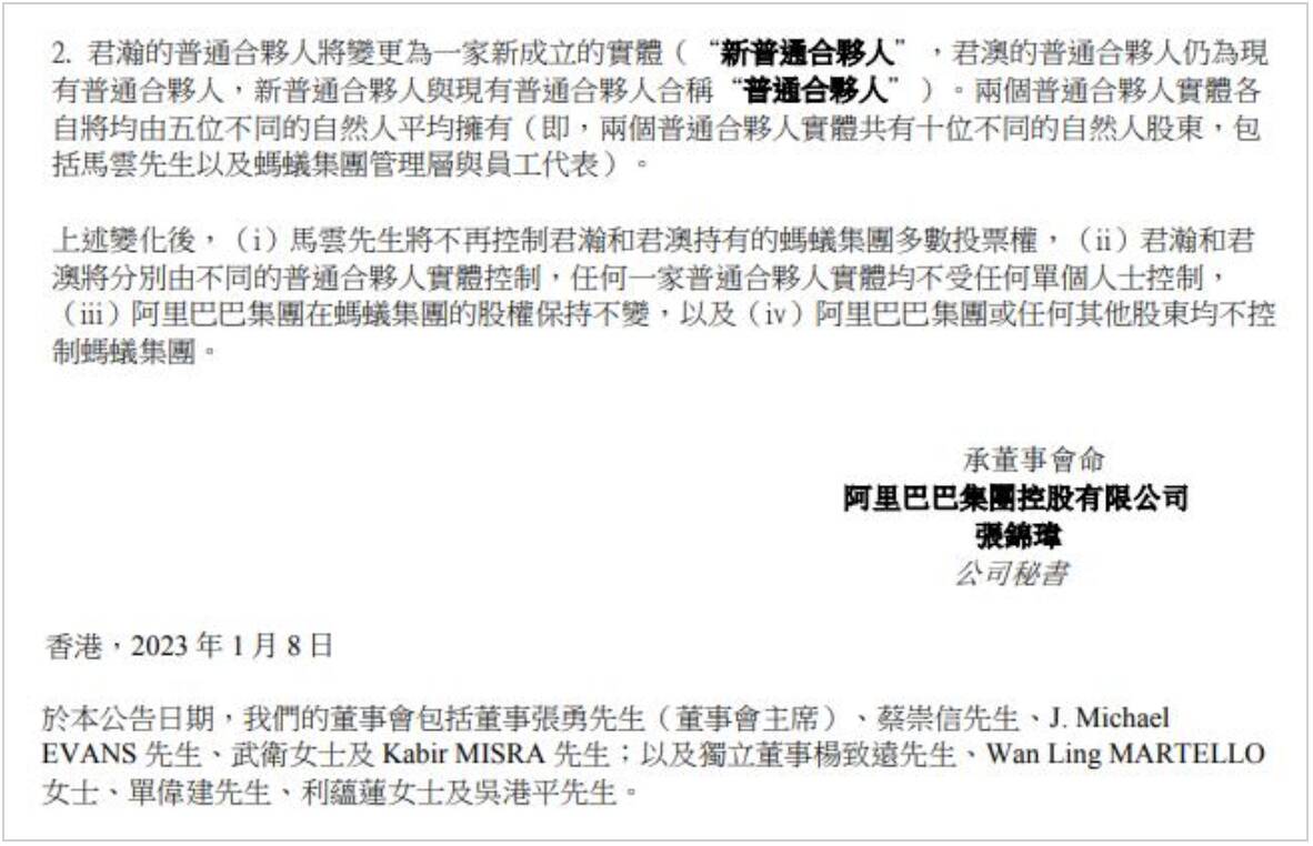 君瀚的普通合伙人将变更为一家新成立的实体,两个普通合伙人实体各自将均由五位不同的自然人平均拥有(即,两个普通合伙人实体共有十位不同的自然人股东,包括马云以及蚂蚁集团管理层与员工代表)。