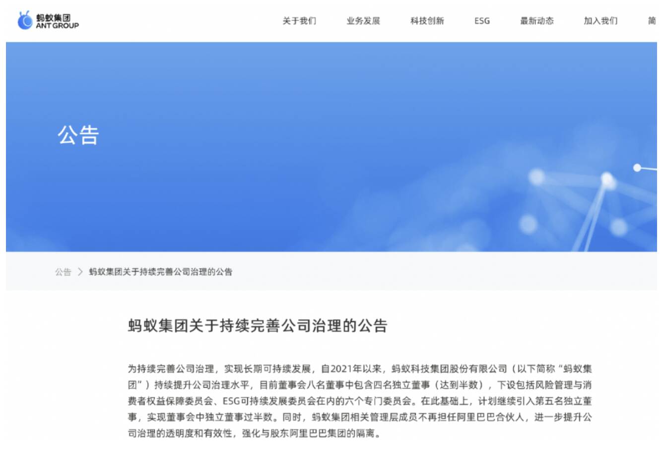 此前一天(1月7日),据蚂蚁集团官网消息,蚂蚁集团发布了关于持续完善公司治理的公告。