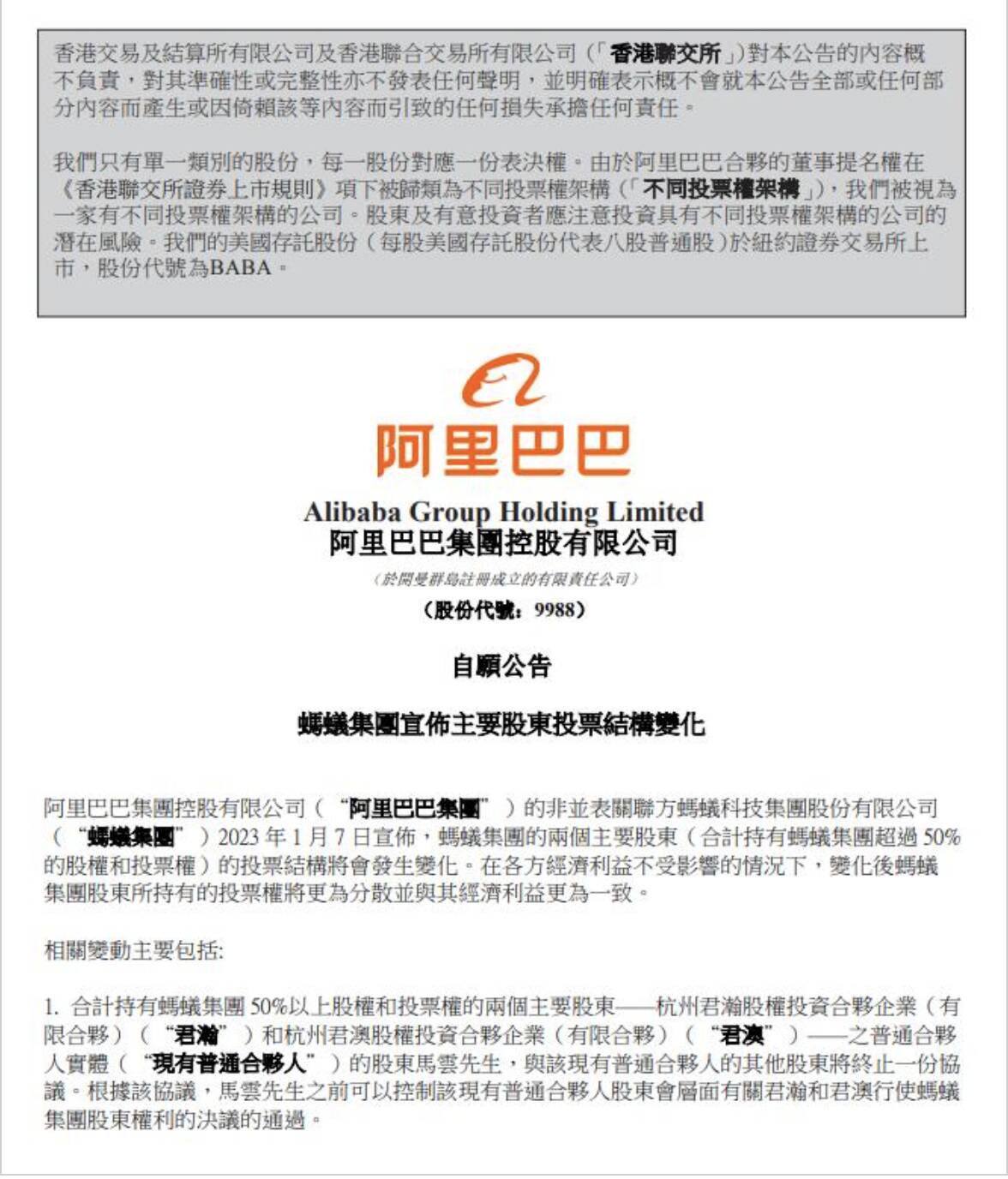 上述变化后,马云将不再控制君瀚和君澳持有的蚂蚁集团多数投票权,君瀚和君澳将分别由不同的普通合伙人实体控制,任何一家普通合伙人实体均不受任何单个人士控制,阿里巴巴集团在蚂蚁集团的股权保持不变,以及阿里巴巴集团或任何其他股东均不控制蚂蚁集团。
