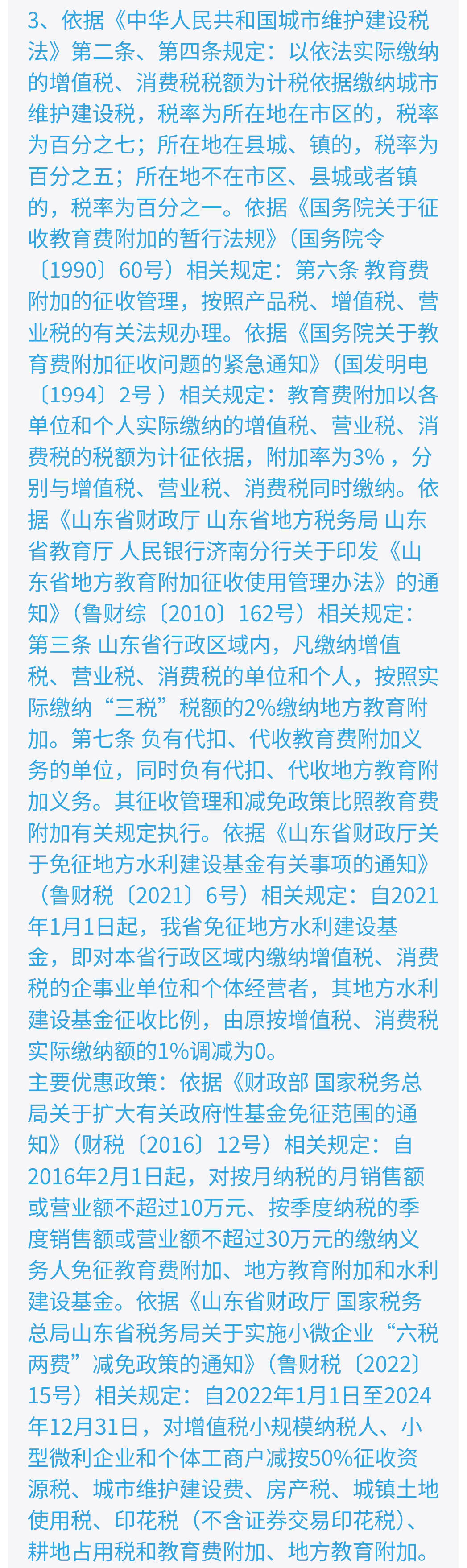 主要优惠政策:依据《财政部 国家税务总局关于扩大有关政府性基金免征范围的通知》(财税〔2016〕12号)相关规定:自2016年2月1日起,对按月纳税的月销售额或营业额不超过10万元、按季度纳税的季度销售额或营业额不超过30万元的缴纳义务人免征教育费附加、地方教育附加和水利建设基金。依据《山东省财政厅 国家税务总局山东省税务局关于实施小微企业“六税两费”减免政策的通知》(鲁财税〔2022〕15号)相关规定:自2022年1月1日至2024年12月31日,对增值税小规模纳税人、小型微利企业和个体工商户减按50%征收资源税、城市维护建设费、房产税、城镇土地使用税、印花税(不含证券交易印花税)、耕地占用税和教育费附加、地方教育附加。