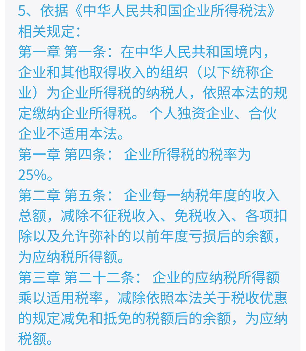 第三章 第二十二条: 企业的应纳税所得额乘以适用税率,减除依照本法关于税收优惠的规定减免和抵免的税额后的余额,为应纳税额。