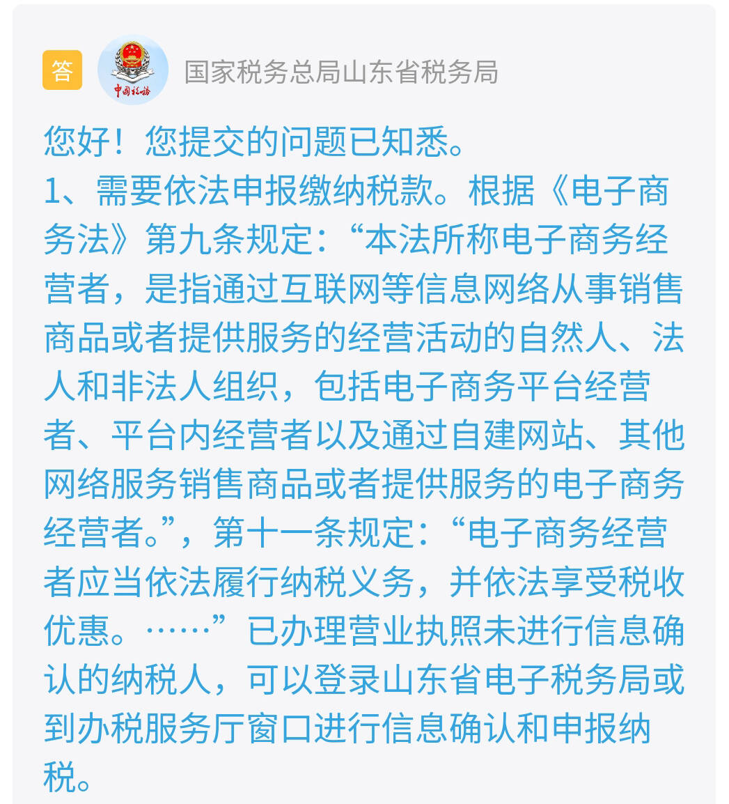 根据《电子商务法》第九条规定:“本法所称电子商务经营者,是指通过互联网等信息网络从事销售商品或者提供服务的经营活动的自然人、法人和非法人组织,包括电子商务平台经营者、平台内经营者以及通过自建网站、其他网络服务销售商品或者提供服务的电子商务经营者。”,第十一条规定:“电子商务经营者应当依法履行纳税义务,并依法享受税收优惠。……”已办理营业执照未进行信息确认的纳税人,可以登录山东省电子税务局或到办税服务厅窗口进行信息确认和申报纳税。