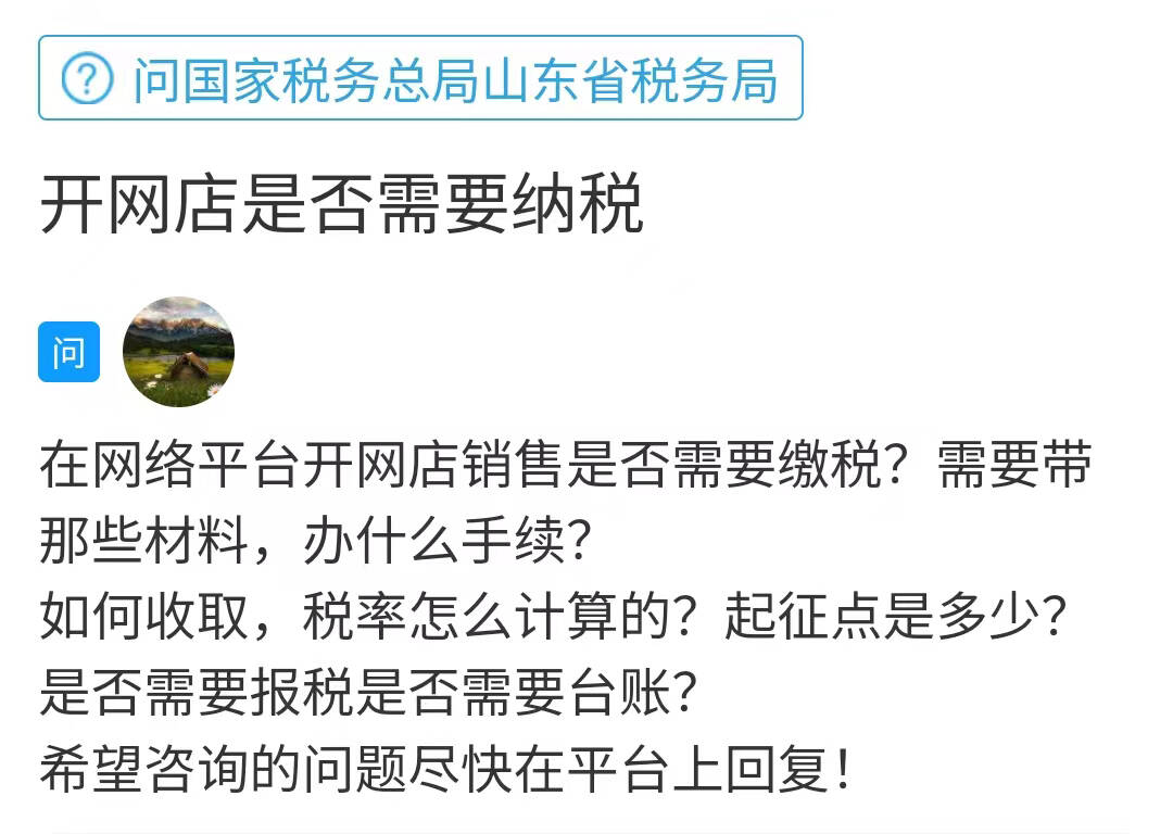 齐鲁网·闪电新闻3月24日讯 不少人选择开网店进行创业。有菏泽网友在《问政山东》网络问政平台向国家税务总局山东省税务局咨询:在网络平台开网店销售是否需要缴税?税率怎么计算?起征点是多少?希望咨询的问题尽快在平台上回复!