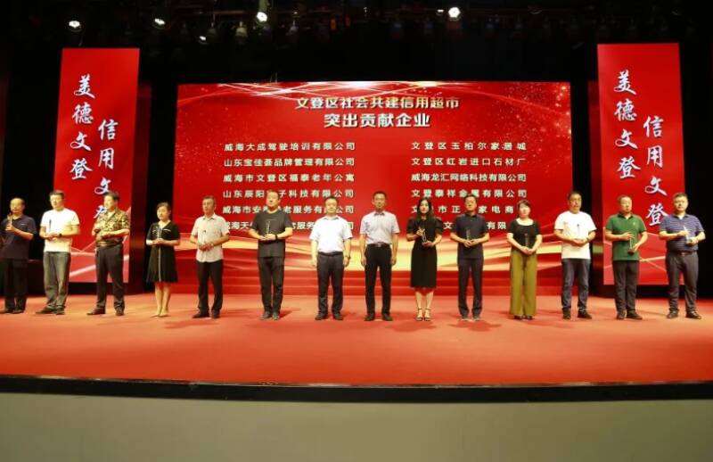启动仪式现场,32家突出贡献单位获得隆重表彰。文登区教育和体育局局长于进军同志与区信用建设促进会会长朱英伟同志签署校企共建信用超市合作协议,高村镇党委书记梁宁同志、金山党委书记孙永卫同志与信珈商贸威海有限公司总经理周先波签署信用超市合作协议。