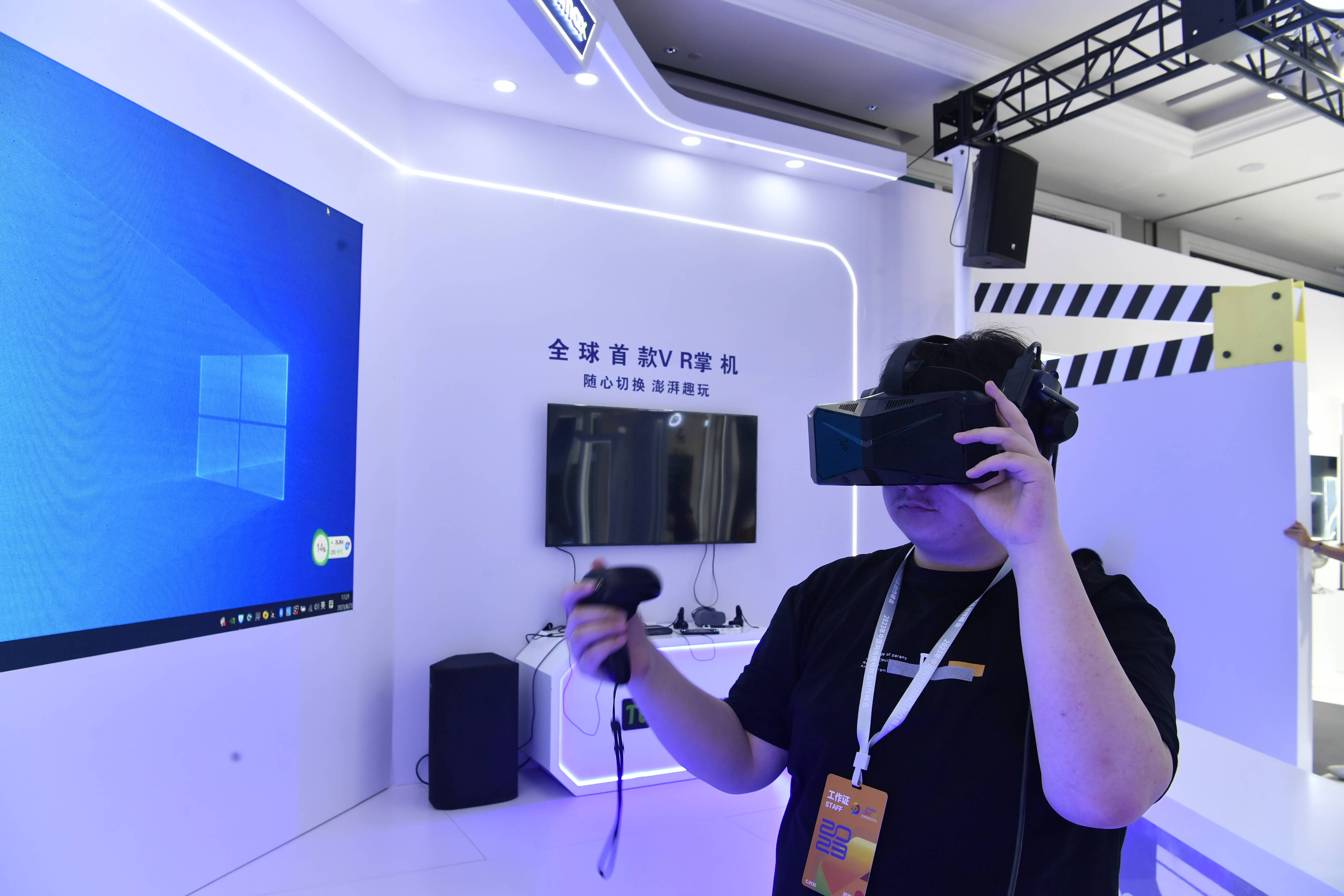 现场设有智能视听沉浸式体验展厅,充分展示元宇宙、数字人AI虚拟形象、人工智能生成内容(AIGC)等赋能内容创作的前沿技术。图为工作人员正在进行调试。