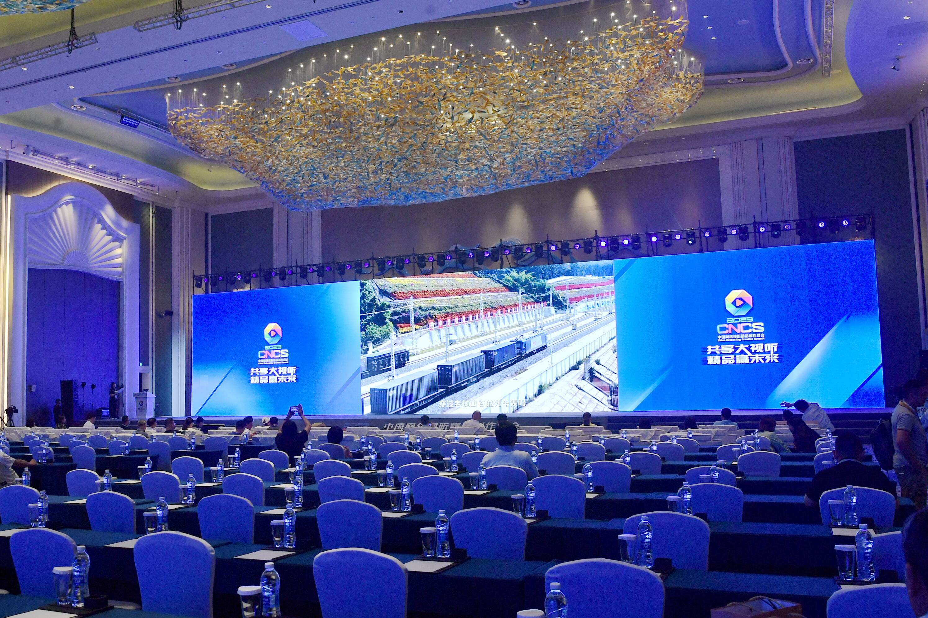 2023年中国网络视听精品创作峰会将于明日开幕,现场工作人员正在紧张彩排。