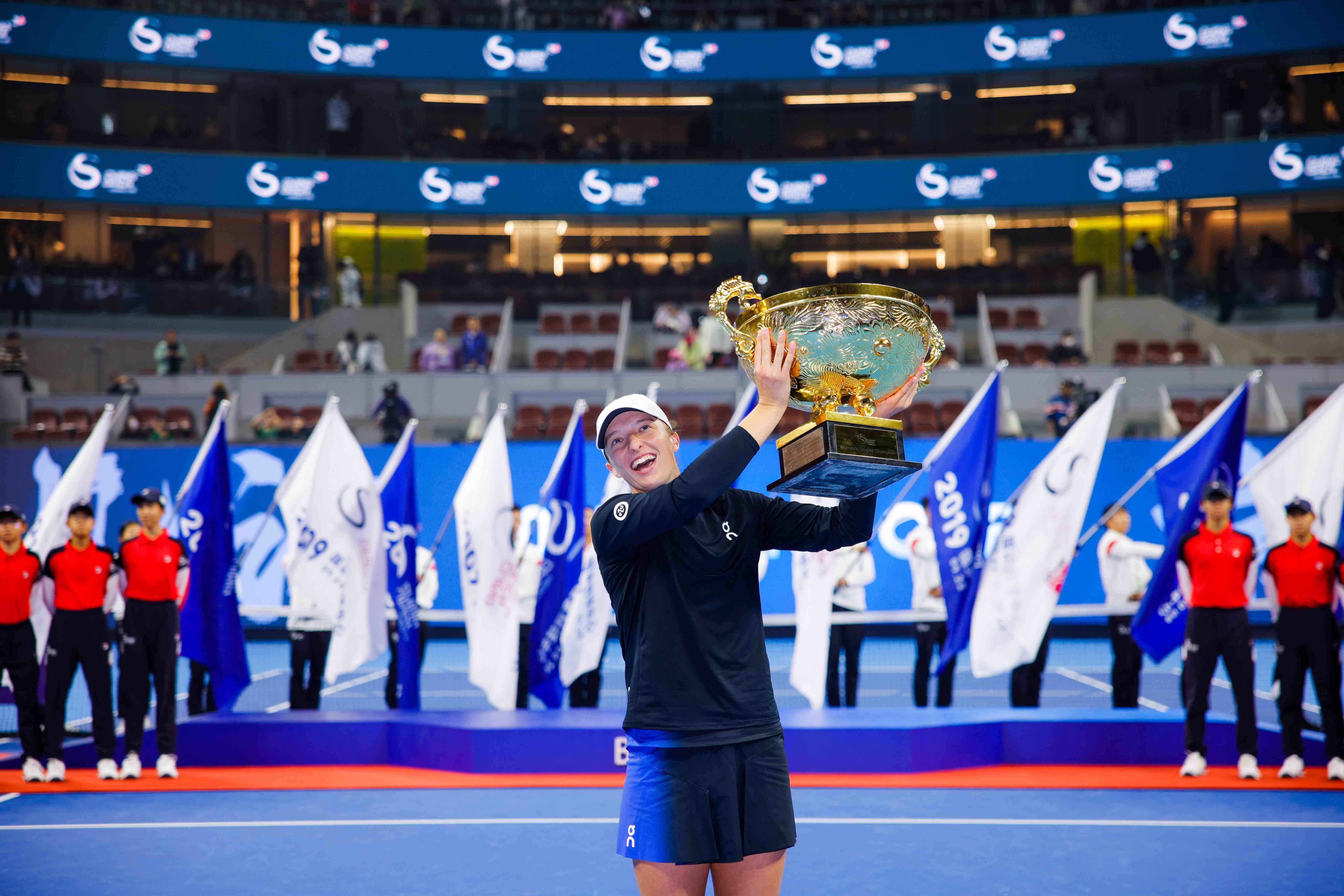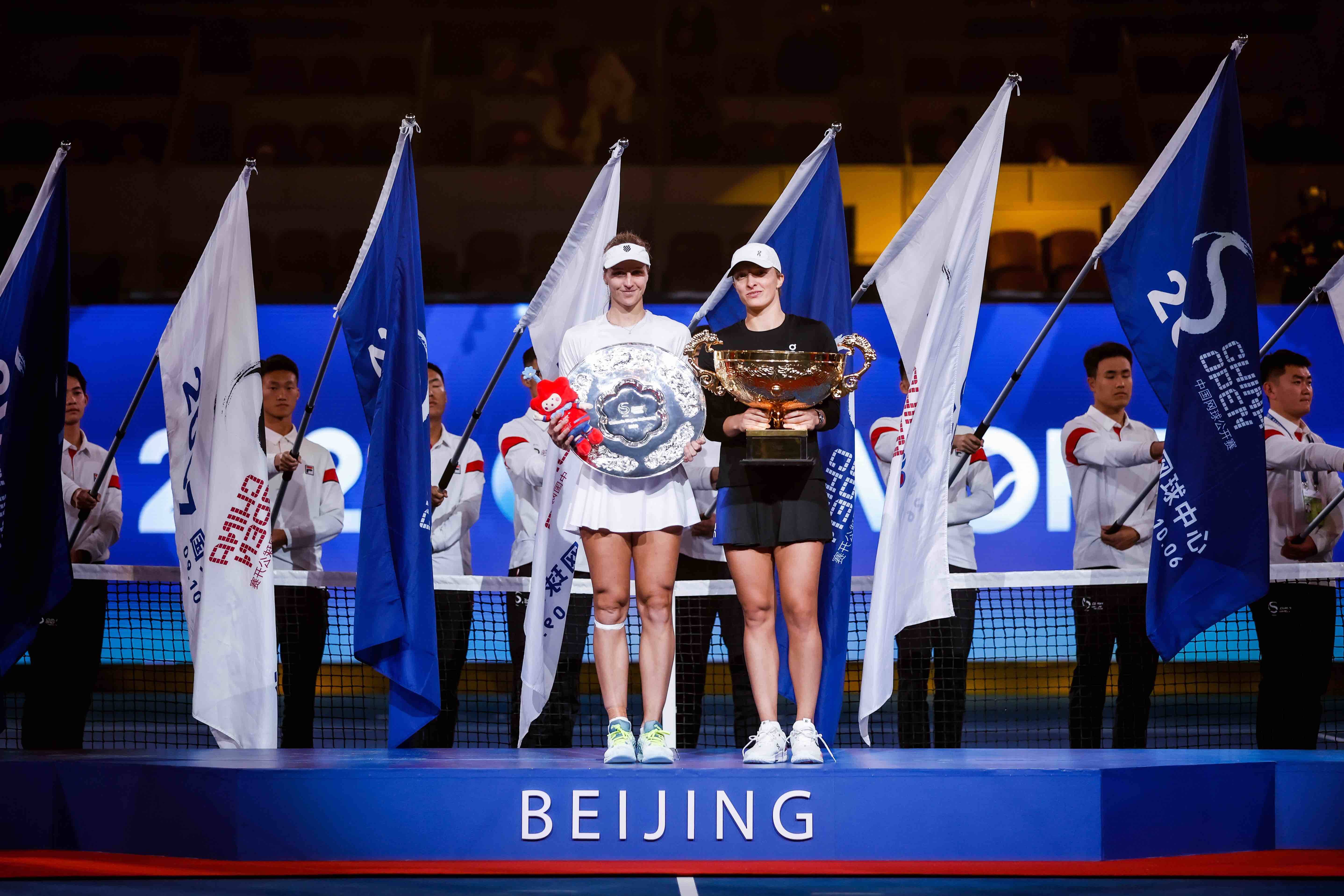 齐鲁网•闪电新闻10月8日讯 2023中国网球公开赛今天迎来收官日争夺,晚间在钻石球场,随着四届大满贯冠军、2号种子斯瓦泰克直落两盘2:0击败赛事黑马萨姆索诺娃,捧起女子单打冠军奖杯,本届中国网球公开赛圆满结束。