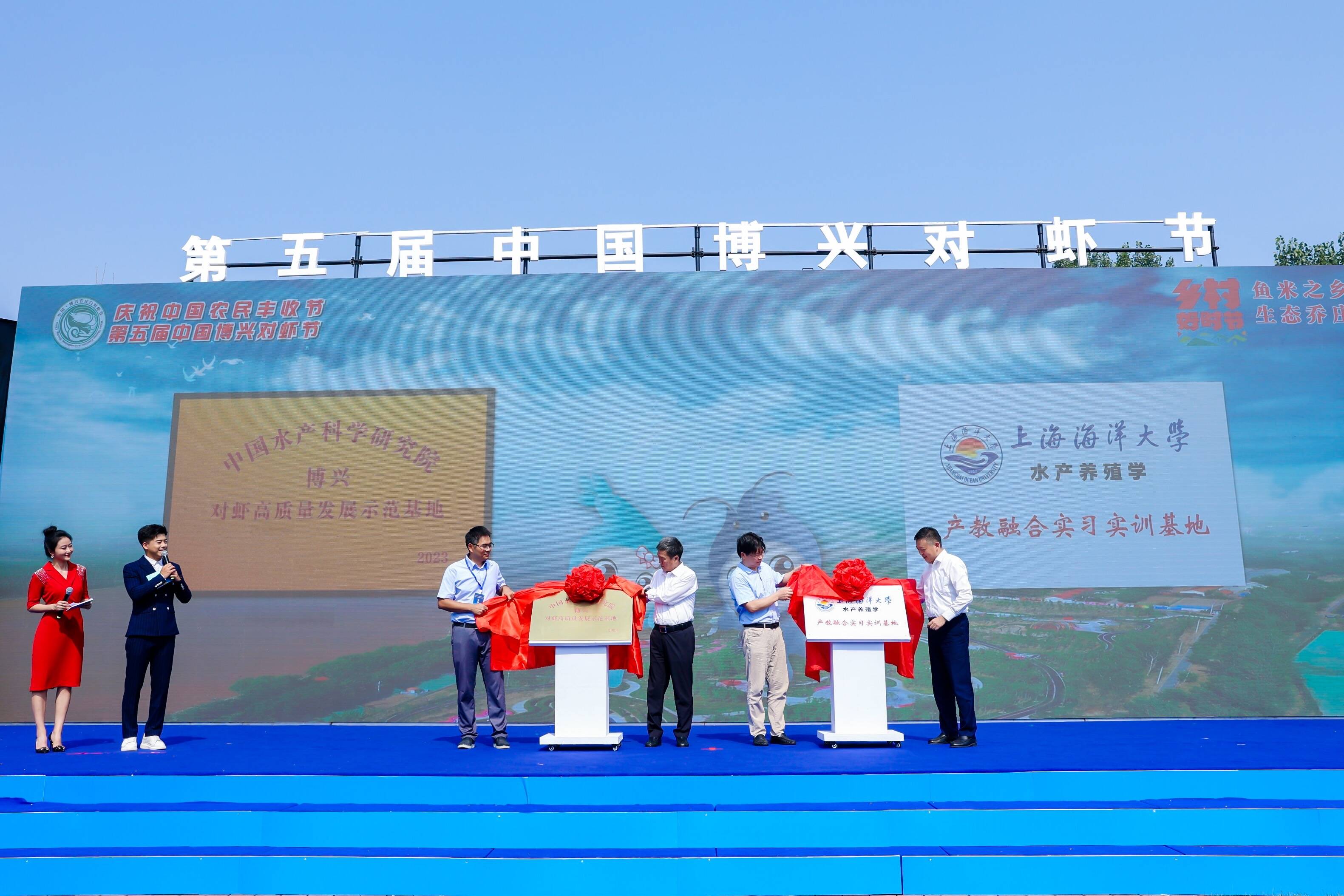 开幕式在热闹的歌舞表演中隆重开场。会上,中国水产科学院副院长韩刚与博兴县委副书记、县长孙战勇为中国水产科学院对虾示范基地揭牌,上海海洋大学水产与生命学院常务副院长黄旭雄与博兴县委副书记王普为上海海洋大学水产生物学产教融合实习实训基地揭牌。