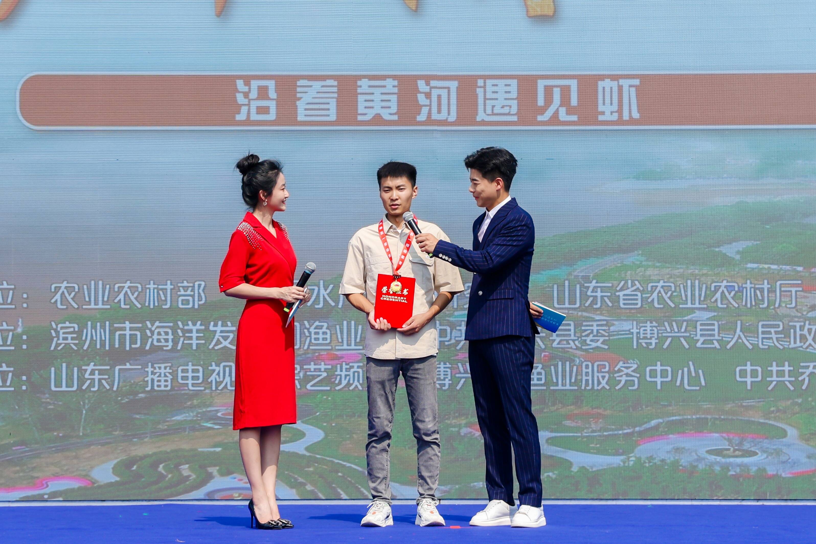 虾跃金秋装满仓,活动现场,播放了开捕仪式及上周举行的“虾王争霸赛”VCR,与会嘉宾共庆丰收,共享喜悦,中国绿色食品协会碳中和委员会主任李可心为2023博兴对虾“虾王”颁发博兴县五一劳动奖章。