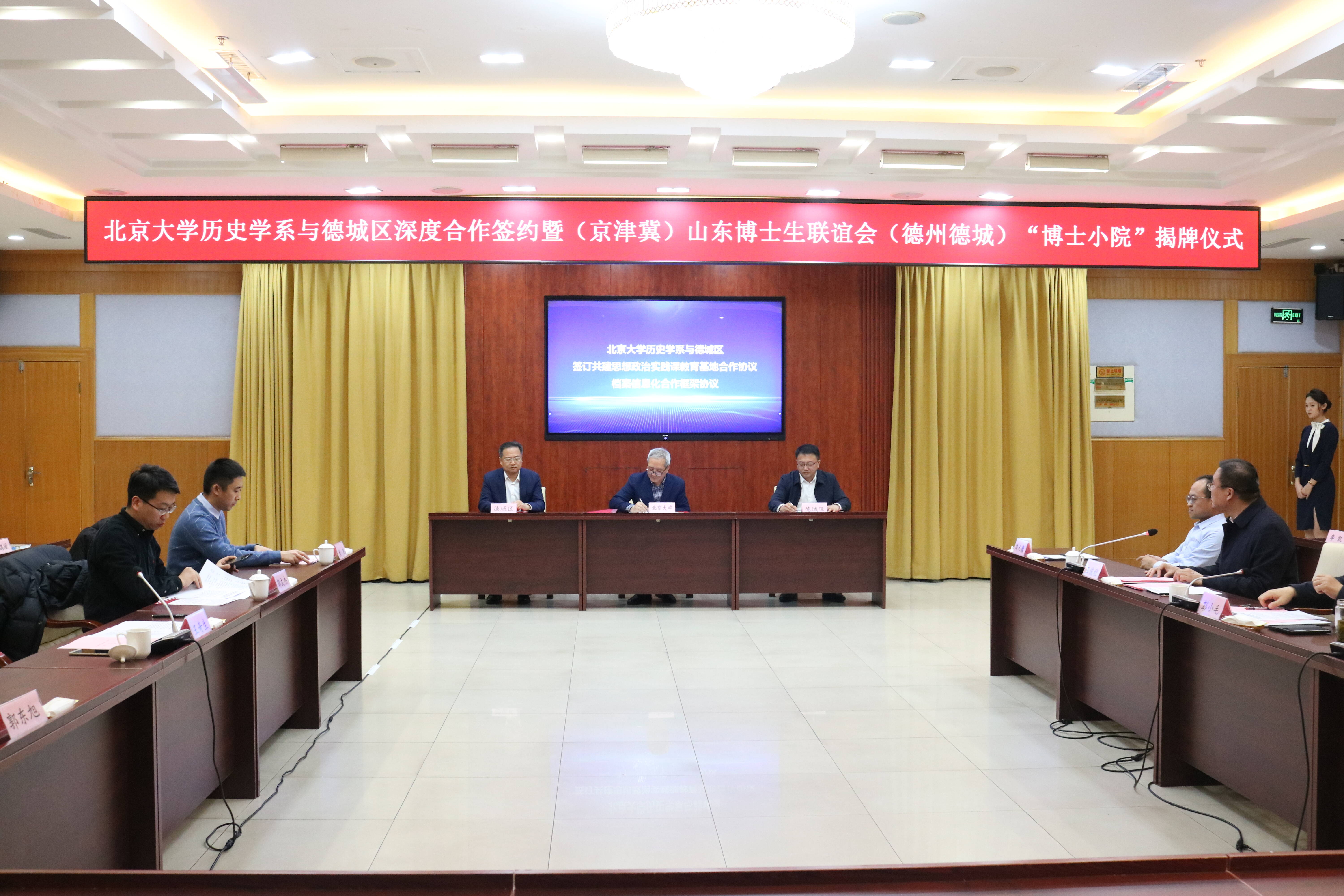 揭牌仪式上,双方签订了共建北京大学思想政治实践课教育基地合作协议、北京大学历史学系与德城区档案信息化合作框架协议、(京津冀)山东博士生联谊会(德州德城)“博士小院”共建协议。王奇生、彭小毛、张泽中和(京津冀)山东博士生联谊会会长郭东旭分别为北京大学思想政治实践课教育基地、(京津冀)山东博士生联谊会(德州德城)“博士小院”揭牌。
