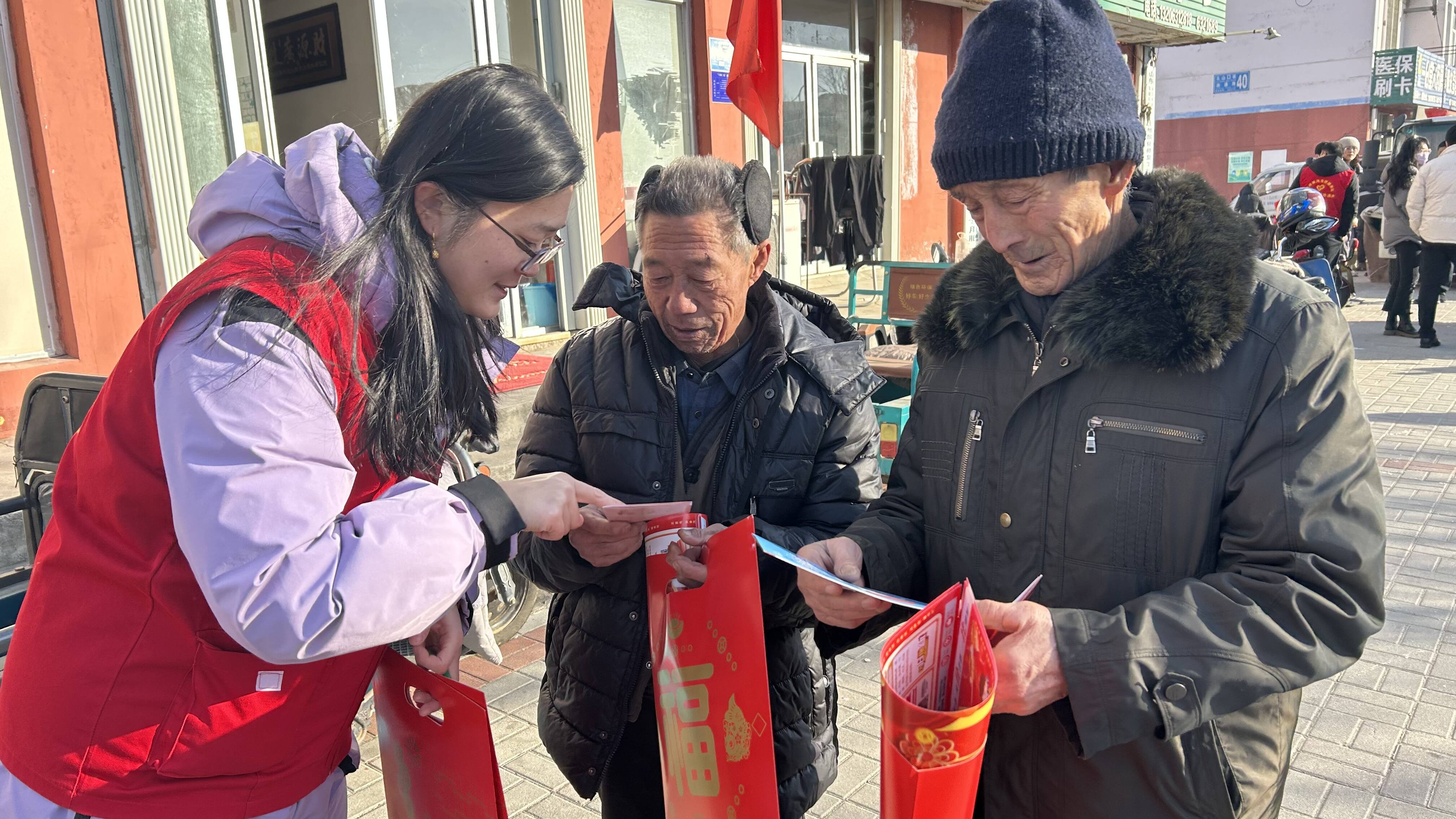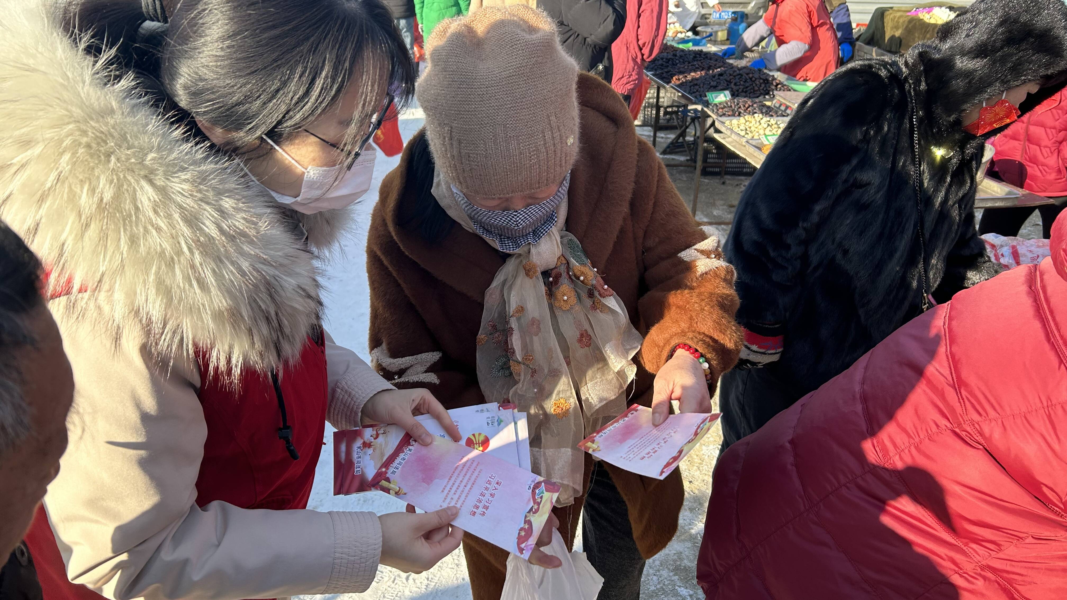 活动当天,志愿者们分组协作,为赶集的群众发放了民法典手册、防范一氧化碳中毒、防范电信诈骗等宣传单页,增强大家对法律知识和安全常识的关注度。活动中,志愿者还结合群众所需,指导他们下载“学习强国”学习平台,宣传乳山市最新的招工信息,并赠送了喜庆的福字和春联。