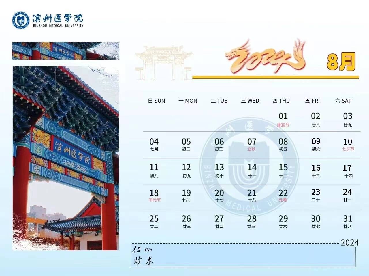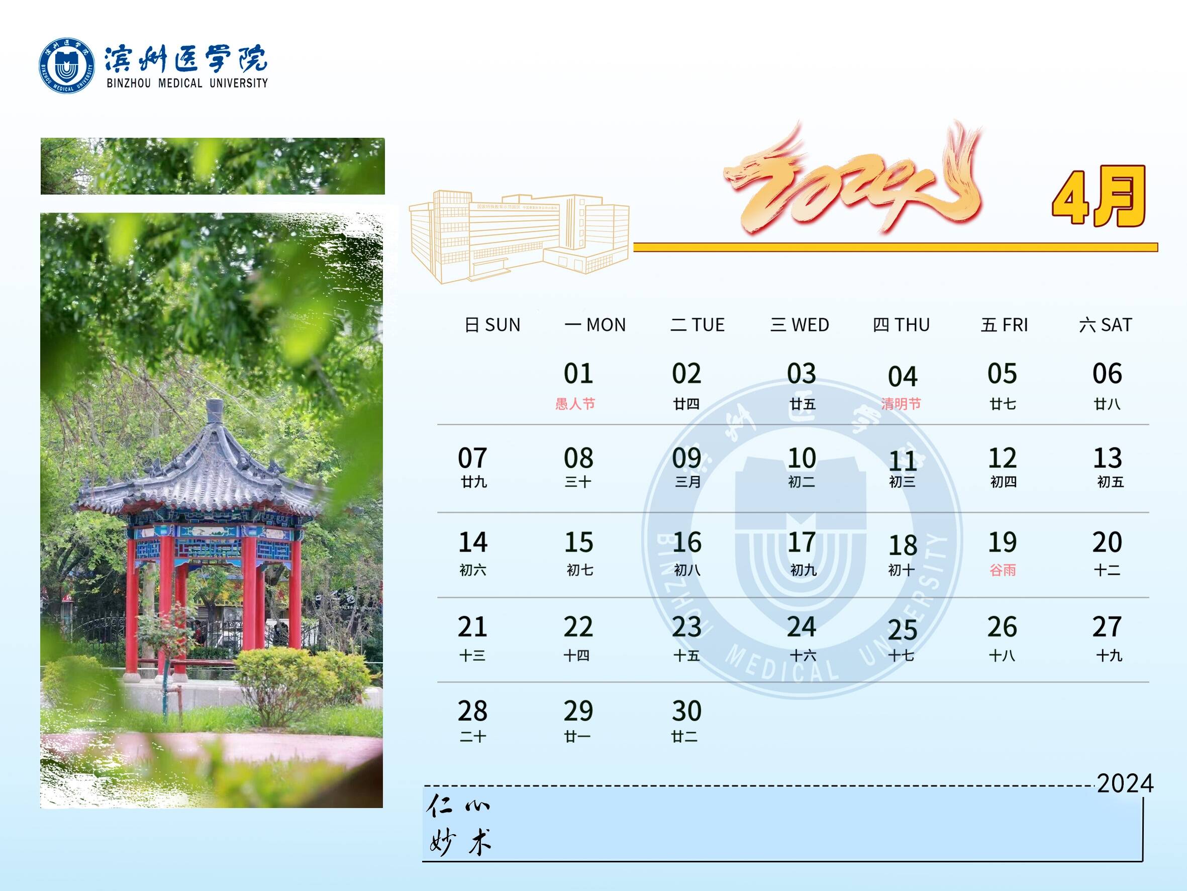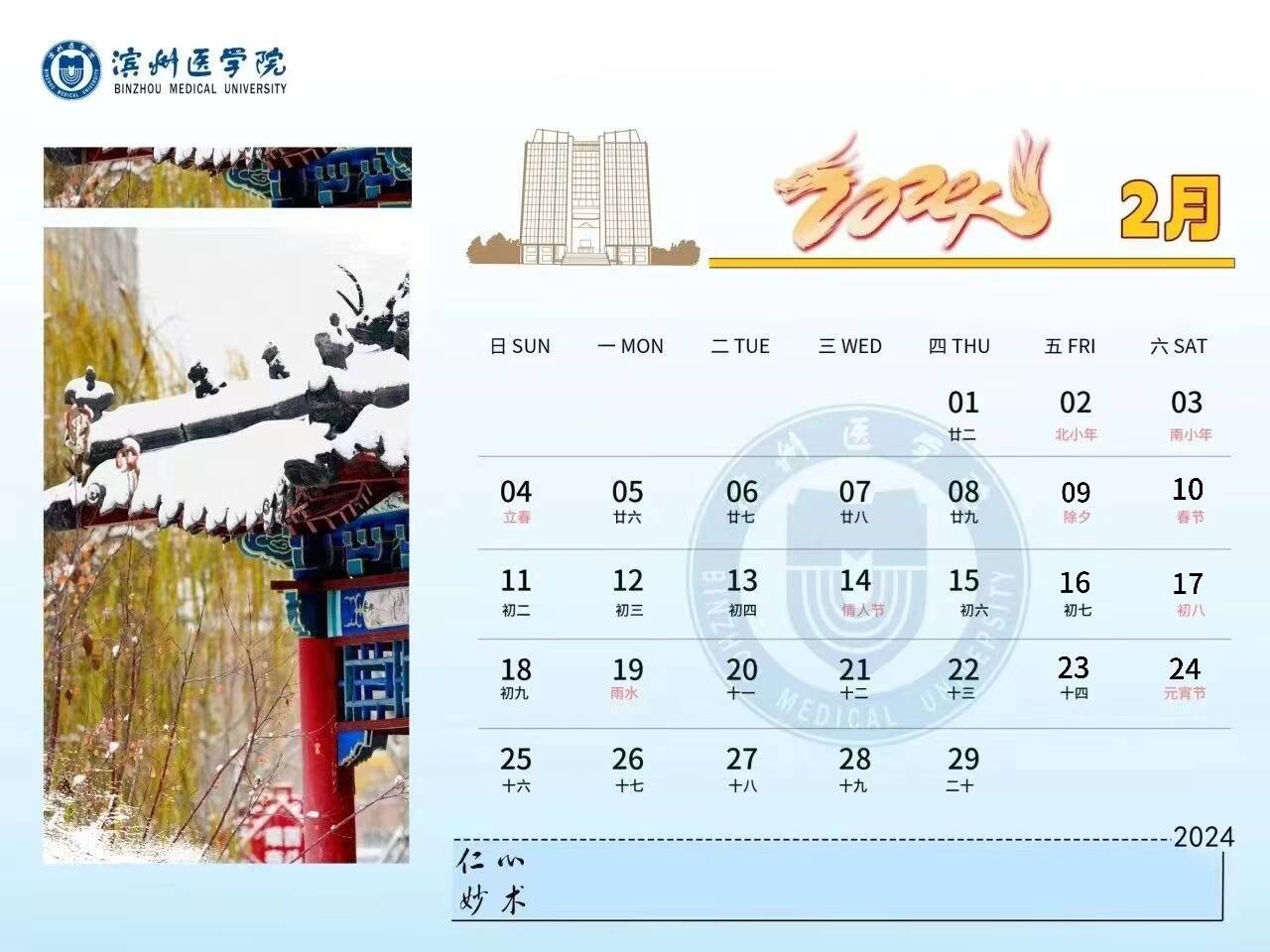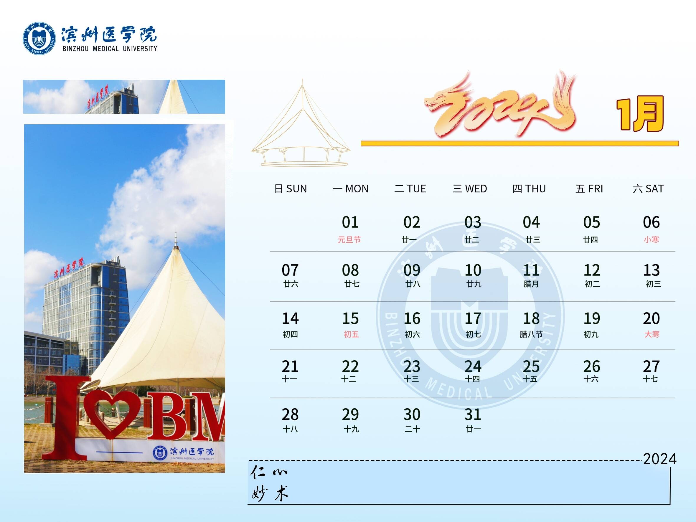 龙腾盛世,春风送爽。2024年,BMUers将继续开拓创新,奋勇争先,快来与小蜜一起查看滨州医学院2024新年台历吧!