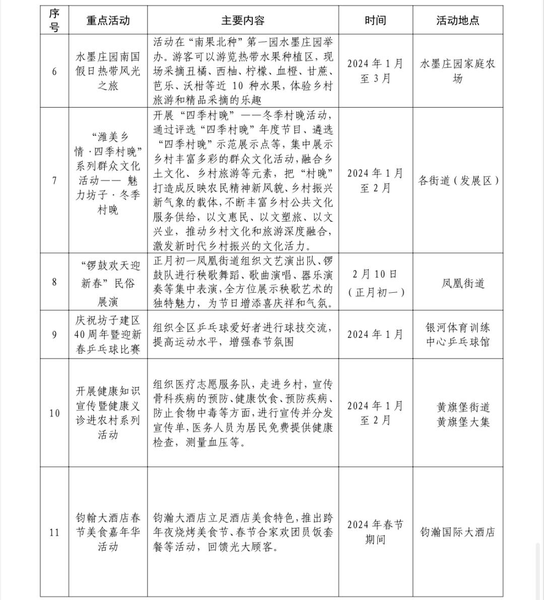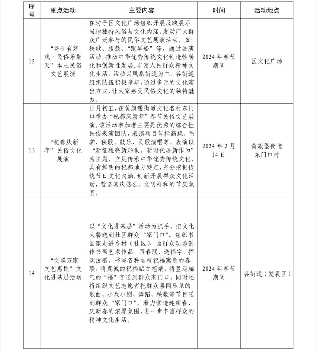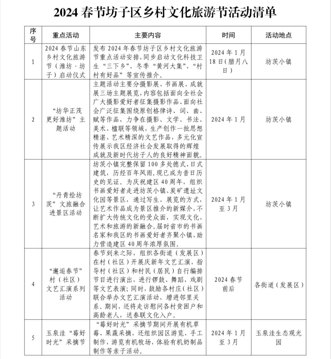 据介绍,2024春节山东乡村文化旅游节(潍坊•坊子)从1月18日开始持续到3月11日,持续近两个月时间,共分为三个阶段,开展系列活动19 项。举办乡村文化旅游节是助力打造潍坊市区南部产业新城、活力之城的有益探索,是拉动区域经济消费、满足群众对美好精神文化生活需求的重要措施,也是展示乡村文化独特魅力、推动乡村文化振兴、促进农民增收致富的重要途径。坊子区将以举办好本次活动为契机,充分统筹利用好地域优势、文化特点、辖区资源,以民俗文化展示体验为重点,组织开展系列丰富多彩的文化活动和惠民行动,叫响“上坊子”品牌,着力营造喜庆氛围,让大家在坊子过个欢乐祥和的春节。(活动清单附后)